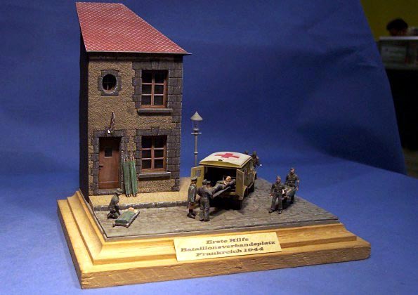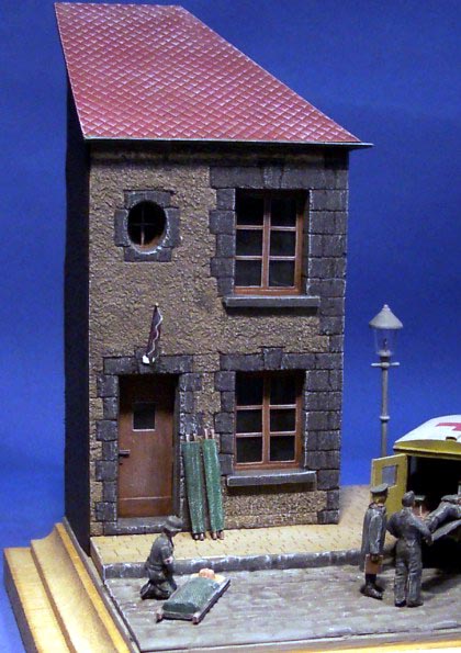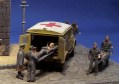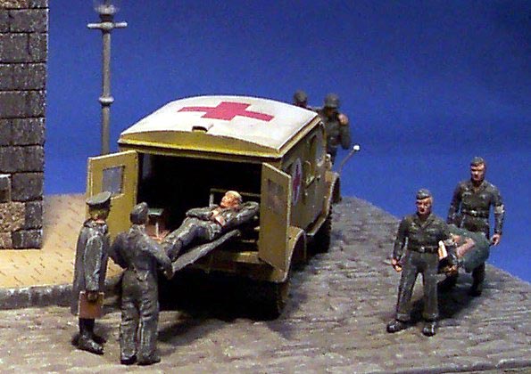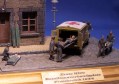 | The dio shows a little First Aid Station near behind the frontline. The house is a converted Kit from JMP. The Truck is a Steyr 1500 with cab from Al.By. I made a complete new rear doors, a holder for the stretchers, a new cabin heater and other small details. The figures come from SMA. A few of them are converted to take them better to the scene. |