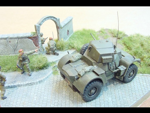 The wall with gate is part of one Matchbox kit. The grass is from SILFOR. The stone pattern on the road is hand made.
