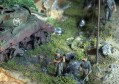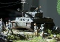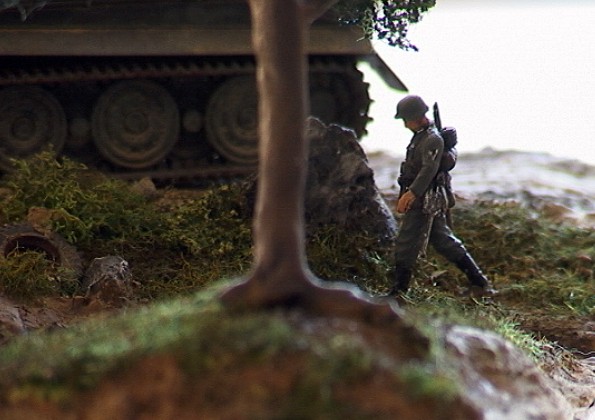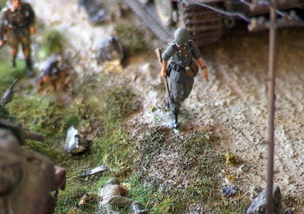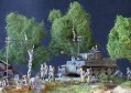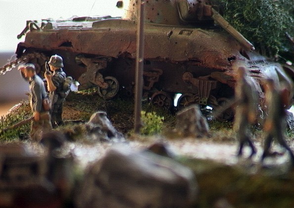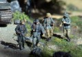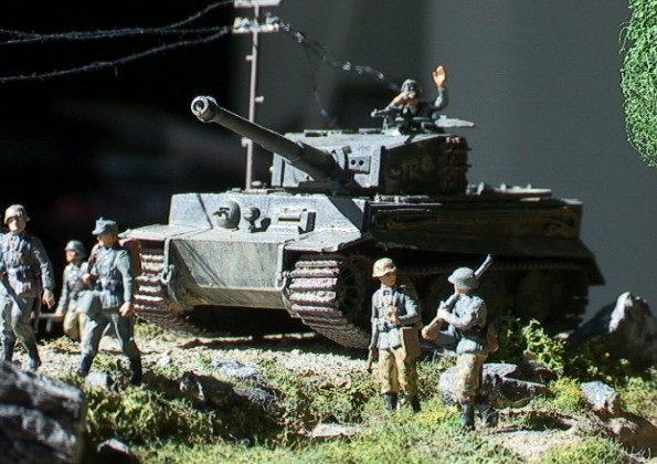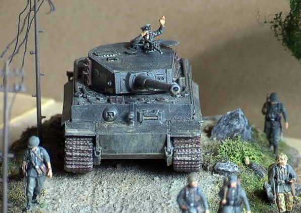 Scale: 1/72 The tank is Revell Pz.Kpfw.VI Tiger. I bought the Preiser set "marching Germans", and just had to make a diorama around these great figures. They've got terrific detail. I added an Airfix DAK guy, and one of the back ones is Revell. The uniforms and tank colors aren’t the correct ones, but I think it looks good this way.. The burnt out Sherman is Italeri. A great set, but poorly built, so I had to trash it |