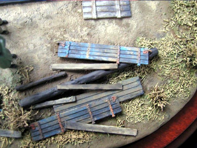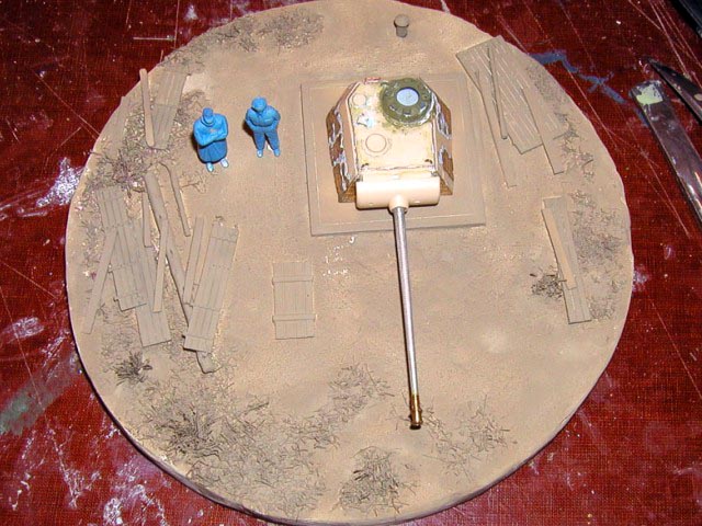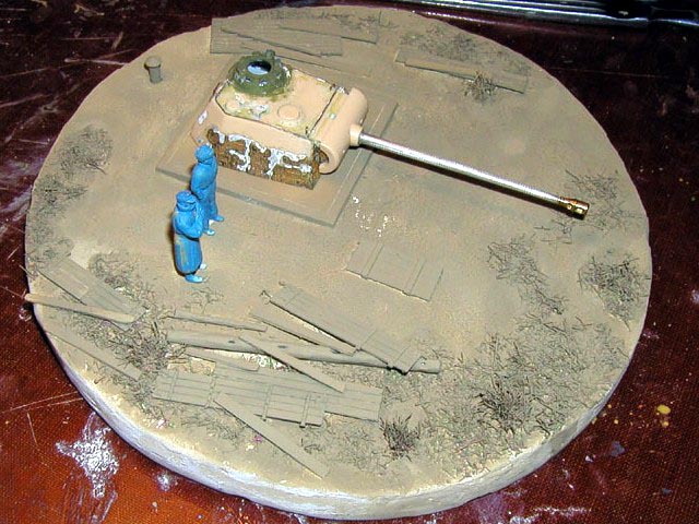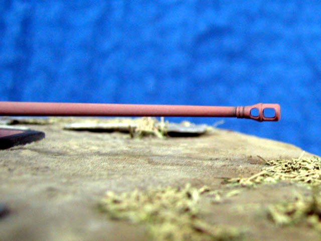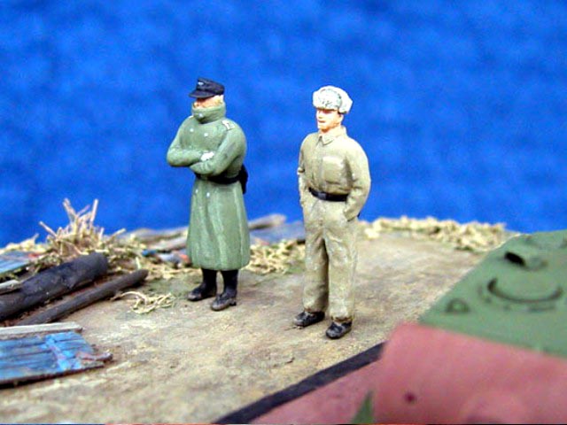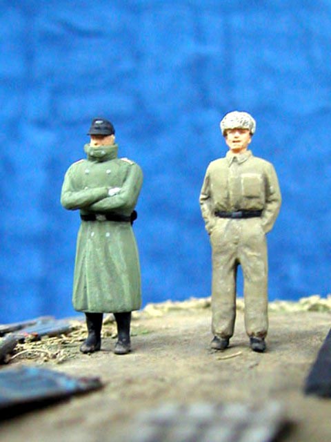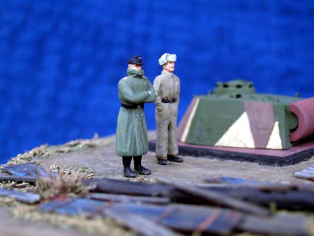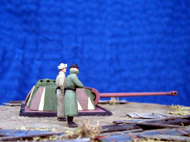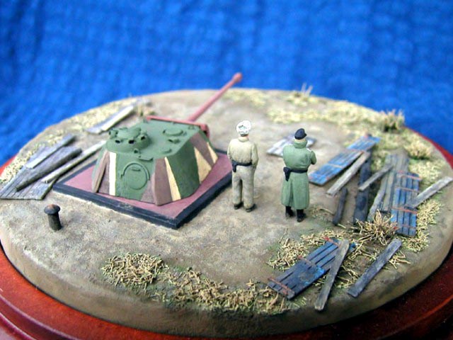 Scale: 1/72 Turret is from Revell kit with commander’s cupola from Dragon. I had to change this item because original had 7 periscopes (6 only in Revell). Gun barrel is from Aber and zimmerit from Part – set for Tiger. Details on turret made from copper wire. Resin figures that I bought some years ago were really nice but too short. Both have new legs from Peiser + some putty. I removed gear and added a new head – guy in greatcoat. All painted with Humbrols. Many thanks for Jeff Hamblen for help with documentation. |