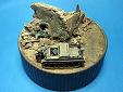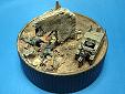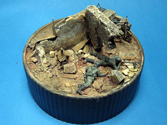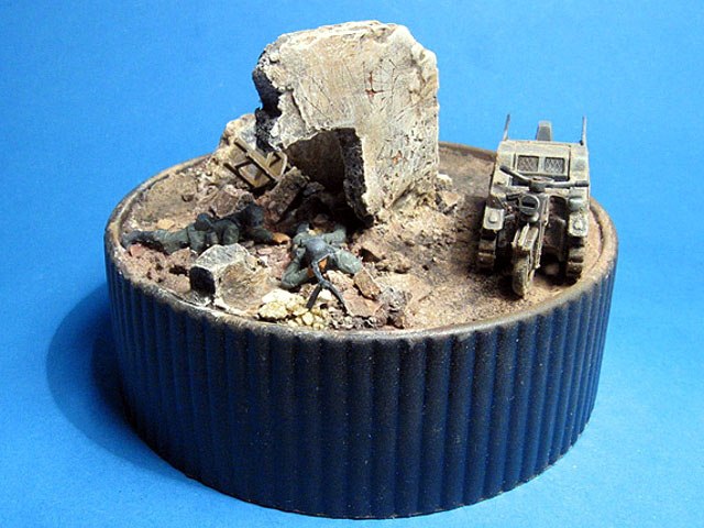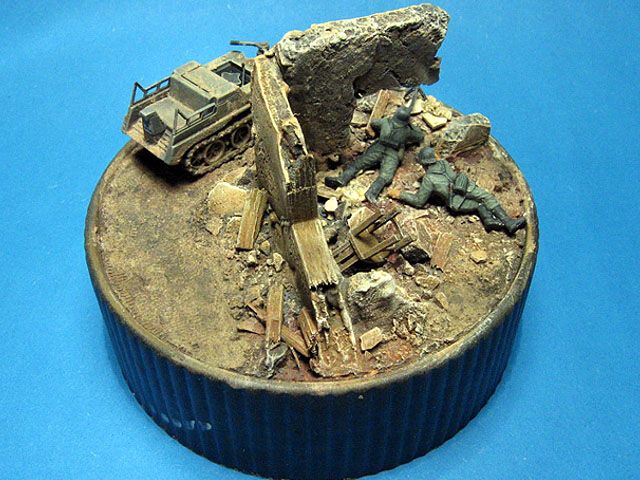 Scale: 1/72 Here is my first coffee jar lid vignette ever. It depicts two German Panzergrenadiers preparing to advance with an abandoned Kettenkrad nearby. The figures are from Airfix, quite simple sculpting, and the Kettenkrad is the academy kit. I used wall spackle for the ground work and for the ruins. It was painted with Tamiya acrylics and weathered with pastels. |