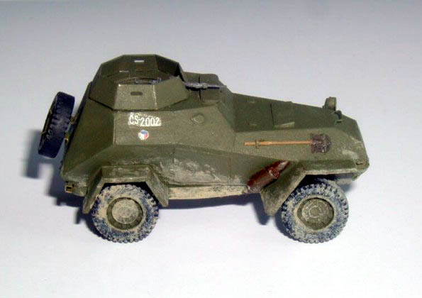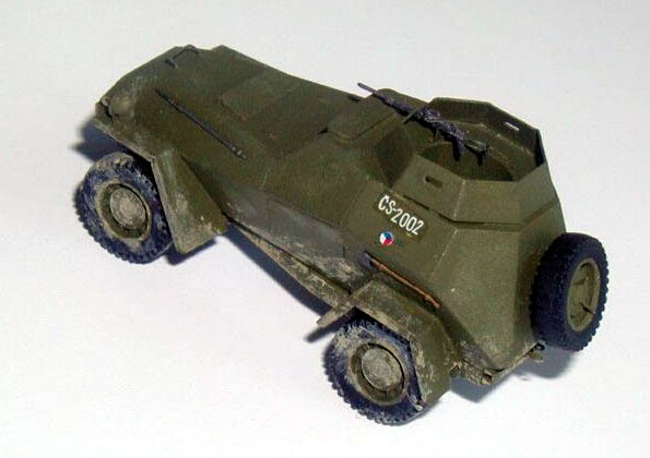 to magazine HPM 12/98. The decals are taken from the decal set "east" Czechoslovak units by VVV Model. I have hand realized the unit symbol as hand-lettered and I had to regrind the surface and airbrush it again when the decal set was realized. It was typical example of model Murphy’s Low. The decals are much finer and thinner than the hand-lettered symbol so I do wasted time to change it. I had no problems modeling of this resin kit with photo etched parts by Extratech I enjoyed it. I looked-in the drawings I have found some drawings of this vehicle in magazine ATOM and I have found some small not important dimension differences between the drawing and the kit. I finished this model very quickly to have very nice small addition for my collection. I have tried to realize mud patina but my model still seems to me too clean than is the car on photo I have found in magazine HPM. |