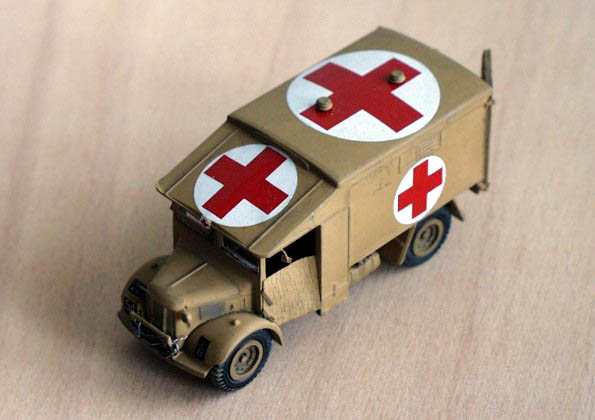 Signal. The decals (division emblem, bridge number, WD number, small red crosses) are my own production using Corel Draw, printed by Color Lase Jet HP 4500 on transparent decal sheet Propagteam. The large red croses are original by Airfix. The interior of driver’s is made according to the photos taken during my visit of National War Museum La Valletta, Malta 1999. The Murphy’s Law is working because I have found some pictures of the interior of space for transport of wounded including details of lifting system for the stretchers on the Internet three days after finishing of this kit. Sandman |