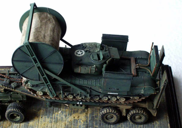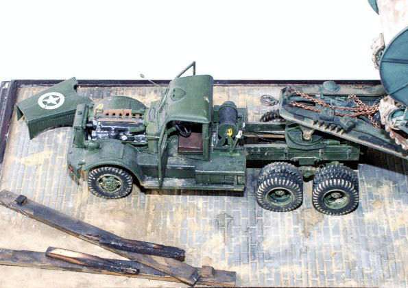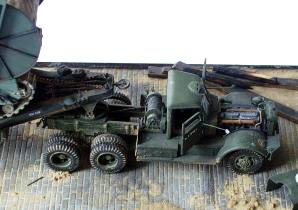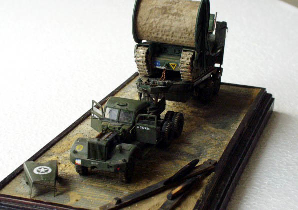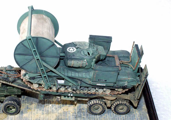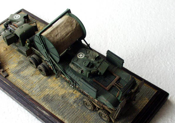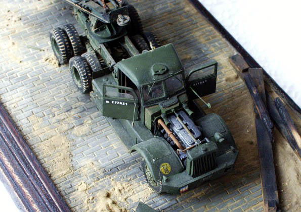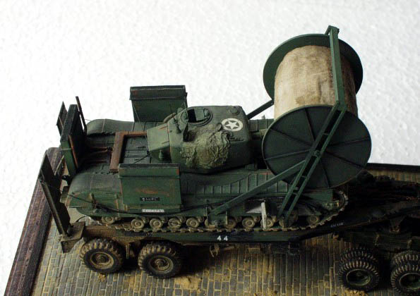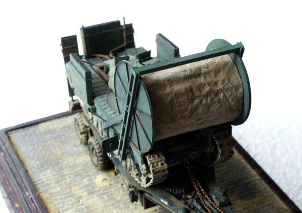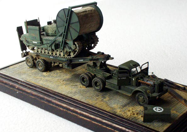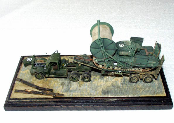 | Documentation: Wheels&Track No 54 Les Vehicles du Debarqement 1994 my photos taken in Transport Muzeum Beverly UK, Duxford UK pictures from W&T, Militaria magazine AIRFIX Magazine – Churchill Carpet Layers by W.J.Cane WHITE STAR PLANE 1997 The model of this experimental type of towing vehicle is more than 80% scratchbuilt. The original kit parts are the side sills, fenders and the pattern of the tires. All other parts are new. I made them using casting technology or made of the plastic sheets, brass, wire and other materials. This Diamond T 980 is airbrushed with Humbrol paint M 117 and patina is realized with M 29. All is finished using technique of ”shadowing”! The decals are my own production using technique of ”brown tape, varnish and paint”. I was building this model together with model of DIAMOND T 981 open cab WRECKER. The model of Trailer is based on AIRFIX kit. I just modified some parts and add some details to get better appearance (the departure blocks, the hold-down rod for the departure blocks, the box for wood, the parking ”legs”, the rope drum, the cables atc.). The model is airbrushed with Humbrol paint M 30 and ”Mickey Mousses” are painted with Humbrol paint M 33. The model of the CHURCHILL Mk. IV tank is based on MATCHBOX - CHURCHILL A.V.R.E.BRIDGE kit. I modified and add few new parts modeling this kit. The model has completely new interior, the induction ports and the exhaust tubes. The side and upper hatches are open also new equipment and tracks are added. The special part of the model is the ”spool” made according to conversion instruction published AIRFIX Magazine. The model is airbrushed with Humbrol paint M30 and the patina is realized with M 29. All is finished using the technique of shadowing. It took me about 400 hours to finish all these models. I placed on 3rd place on IMPS UK show in 1998 and also on 3rd place on Czech republic Model competition 1998 with these models. Mgr. Petr Dusek - Ricany |