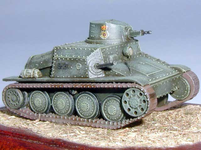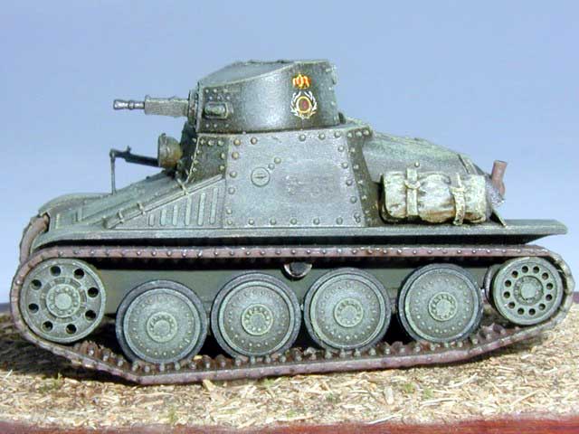 Scale: 1/72 Kit producer: Attack This model is built from shortrun plastic kit. Most of part are well moulded with crisp detail only tracked suspension is little simplified. I have built this kit in about one hour and I haven't used much putty. I just have replaced fine details (MG, tools ...) with my own more detailed parts and added some canvases. I have used one of Romanian markings form kit decals. The patina is created with lightened camo colour, oil colours wash. The final layer is Agama flat warmish. |