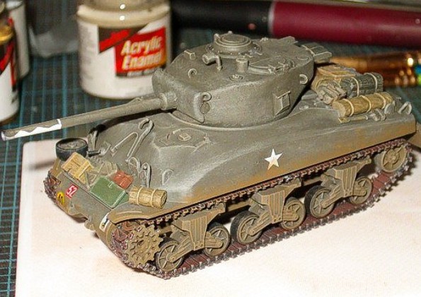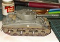 Scale: 1/72 It's a model of a Polish Sherman IIA from the 2nd Armoured Regiment, 1st Polish Armoured Division, May 1945, somewhere near Wilhelmshaven. I got the ideas for the markings from a book by the Polish publisher Militaria, "Polskie Shermany vol. II." The model itself is from Italeri which has been re-releasing old Esci kits for the past year or so. However, Esci originally based their model on a museum reconstruction with a M4A1 hull but a 75mm turret. Except for a few DD tanks, it seems to be a very rare beast. Luckily, Armo has come out with resin 76mm turrets, both early and late. This is the early, and includes some photoetch parts and a turned aluminium barrel. Excellent value. I added a lot of stowage from Mars and Armo and a gascan from Academy. I scratchbuilt the British stowage box on the rear plate. The white stars are from Italeri and were very good for kit decals. The other markings came from an old Intech booklet on Polish Army vehicles. I had read that this company had problems with their decals so after testing one (it shattered as soon as I touched it), I coated the rest in Microscale Liquid Decal Film and saved them. I carefully taped up the barrel and painted the white design; it could have been a bit finer but my eyes are getting worse the older I get. |