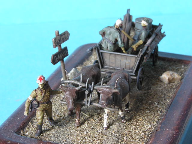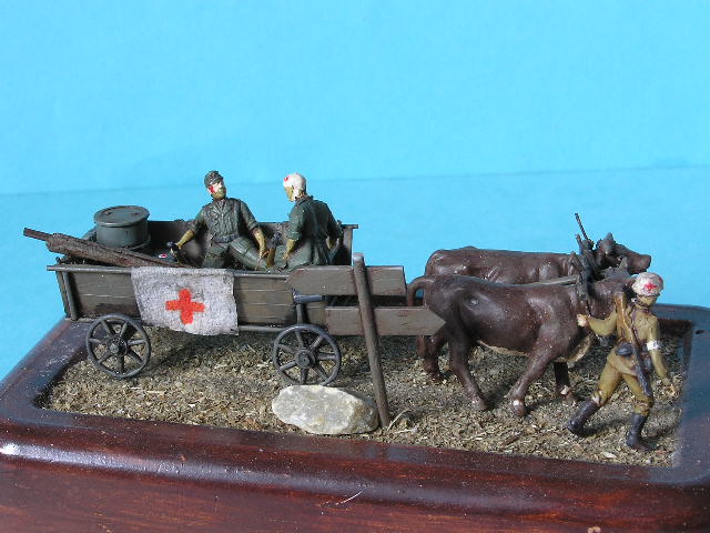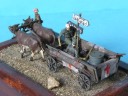 Filed ambulance carriage. The carriage is scratch with wheels from Pz.IV kit, the cows are form Preiser animal set. and figures are from Revell.