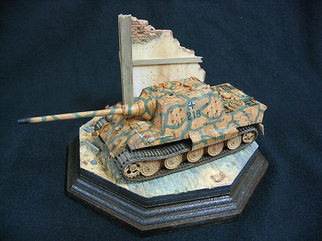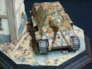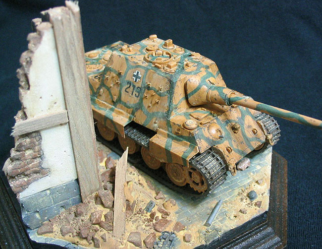 Scale: 1/76 Used kit: Fujimi This kit has poor quality, so I added some details. I used Humhrol enamels to paint it and weathered with pigments, oil paints, pastels. The building and road were made of low-expanded styrofoam, gesso, wood. etc |