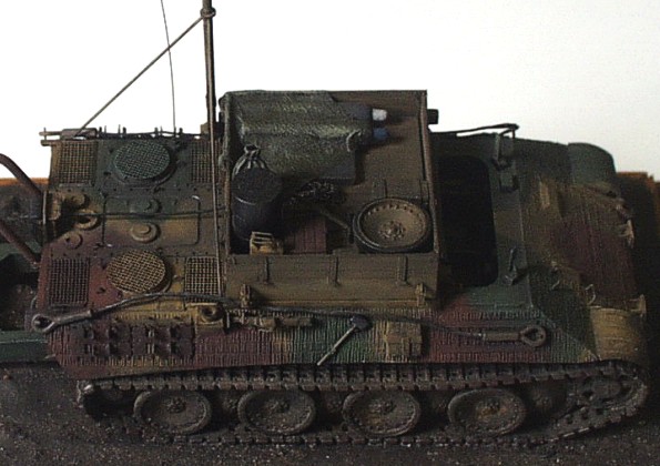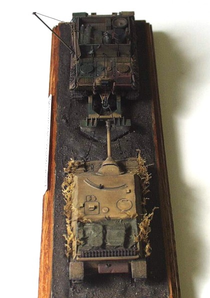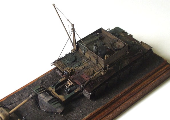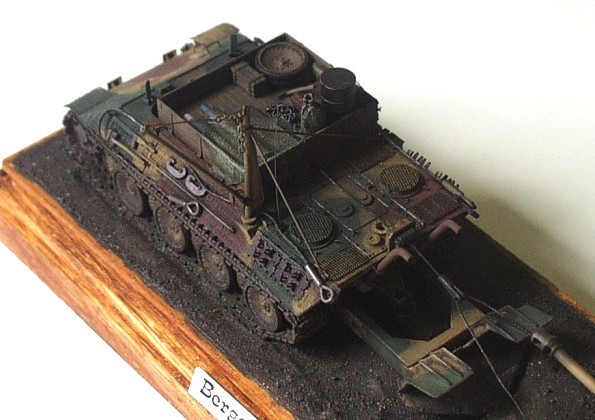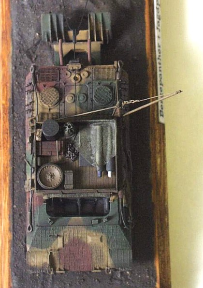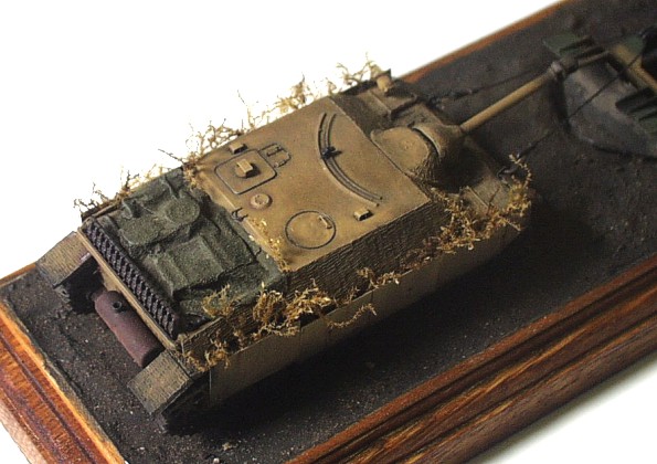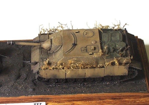 Used kits: Panther Ausf. D, Revell, 1/72 scale The model of the Bergepanther is conversion of Revell mentioned above. I removed the turret and scratchbuilt new ”wooden” bodywork on its place. The other parts differnt form the parts of standard tank are also scratchbuilt (the drums, the crane, new exhausts, the tools, wooden beam as well as the big share on the back of the vehicle). The interior of crew chamber is open so I had to scratchbuilt it also. It includes the gearbox, the seats, the steering, the torsion-bar springs as well as many other details. The model represents the vehicle with ”zimmerit” coating so I created it with help of two-part putty and watch screwdriver. This model of the wrecking vehicle is camouflaged according to ”In Action” publication and represents machine used by unknown unit in France in 1944. It took me about 70 hours to complete this model. The model of Jagdpanzer IV is built out of ESCI kit with only few modifications on the vehicle exterior (the periscopes, the side sheets (schürzen), the fenders made of aluminum sheet atc.) The model also represents the vehicle with ”zimmeriot” coating served in France in 1944. It took me about 25 hours to finish this model. |