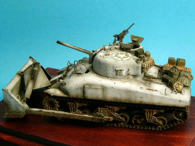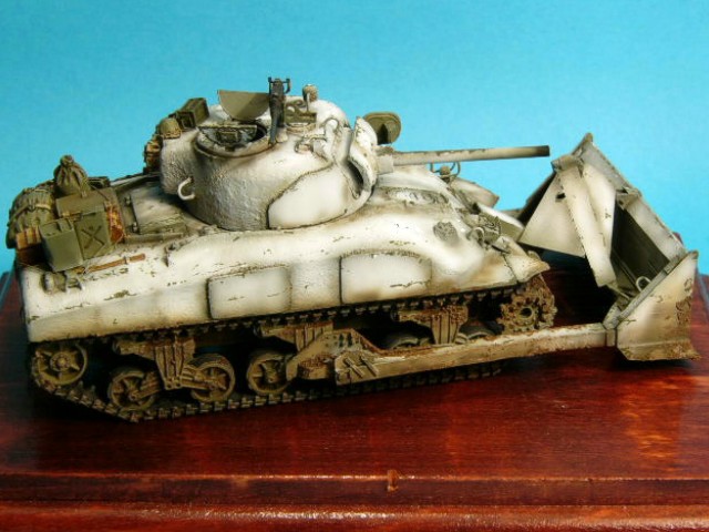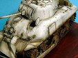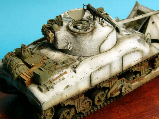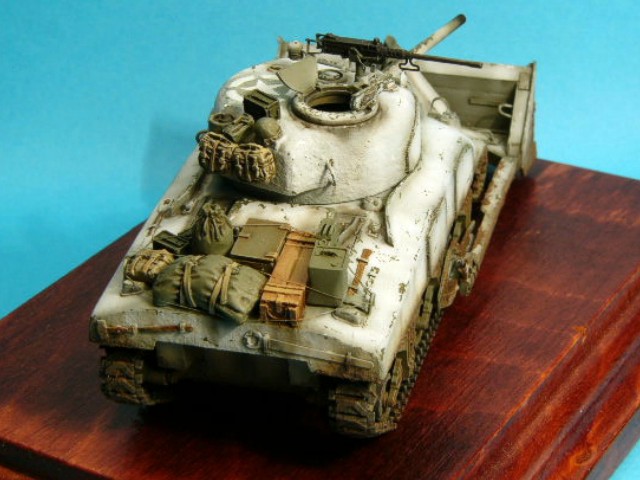 Scale: 1/72 The base of this model is old Sherman kit from ESCI. Upper hull part is from Armo resin conversion set but with cut off hatches replaced with new from Extratech plastic kit. The turret loader's filled with putty and commander's hatch is also from Extratech kit. I also used some Part etchings fro detailing. Cast armor surface is created with Surfacer 500 from Gunze. The M1 Dozer Blade is from FSF resin set. Accessories if from Goffy (backpacks, tarp, helmet, crates ...) and from Extratech (can, M2 mg). It's my first attempt to finish model of tank in winter camouflage. The patina is mostly created with airbrush. The bud is from MIG pigment, MIG gel and plaster. |