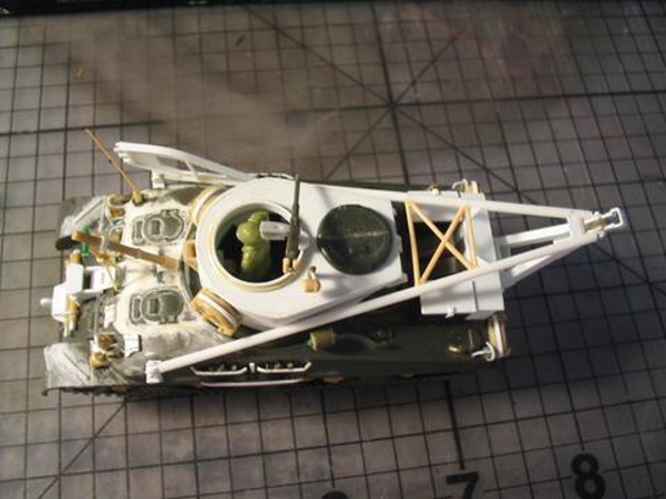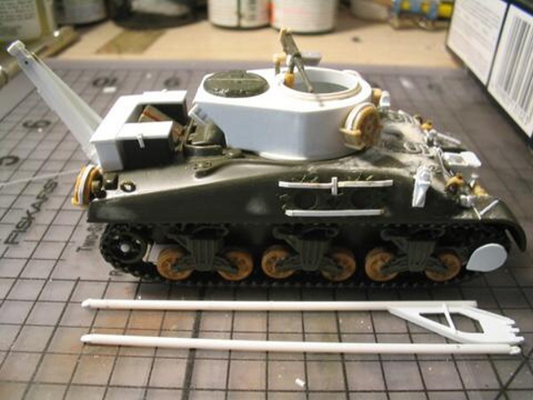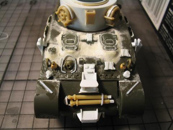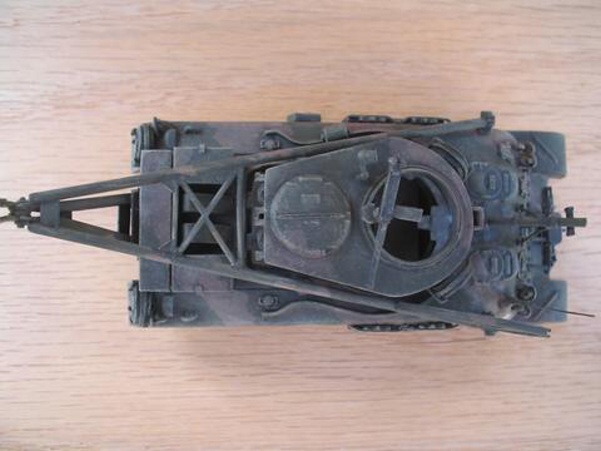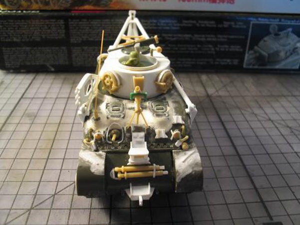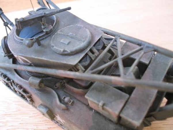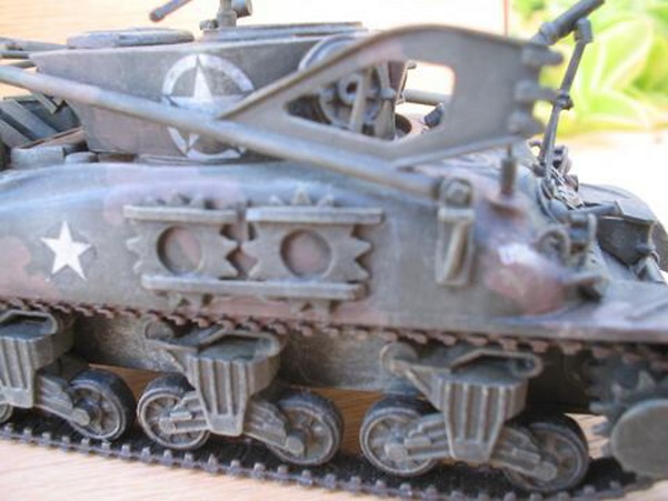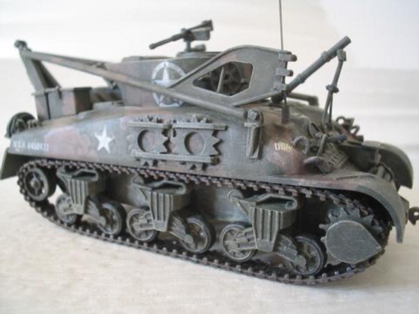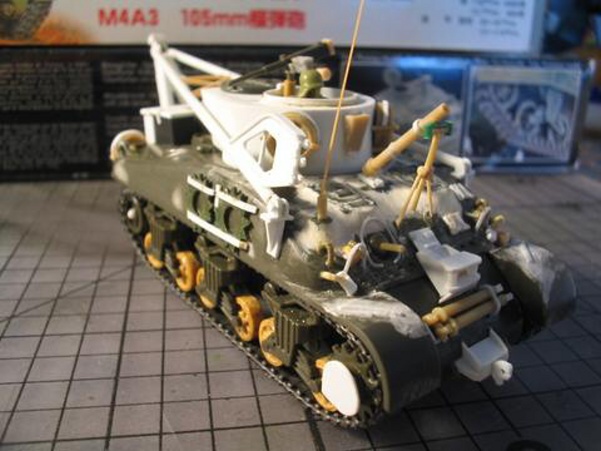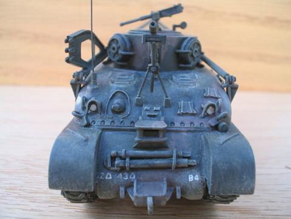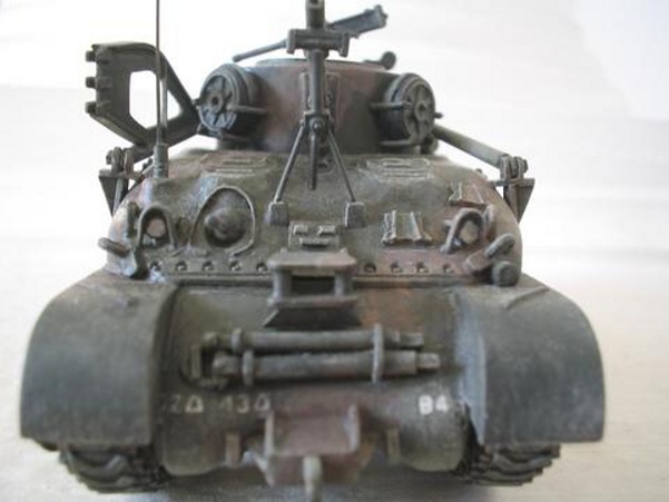 Scale: 1/72 Manufacturer: Spare parts from Revell (hull), Italeri (tracks), and Hat (hatches and cupola) with sheets and rods of styrene, and stretched sprues. These parts are left over from my M4A3E8 with sandbags, and M4 with composite hull projects. I studies many photos downloaded from the internet and an article (Israeli M32) from Faustnik. I noted that Italeri has a 1/35 scale model of M32, except it has the late 47 degree hull (a post-war model). So for WW II, I had to back date the front hull with small hatches (from Hat) and move the vent to the front. The wheels that came with Revell M4A1 are too big and are replaced with my squash cast copies of Firefly wheels. I know that this is a mixed bag of parts that are not exact in scale, but I am happy with the end result. |