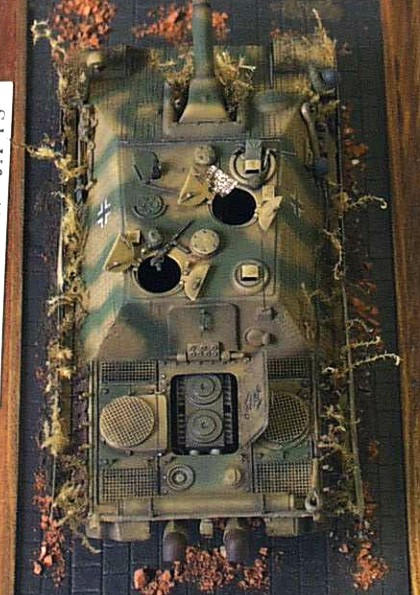 ”Jagdpanther”by ESCI Accessories: etched set by Eduard This model of known German tank hunter is built out of the ESCI kit but it’s modified to later production version G with higher engine air inlet. I scratchbuilt practically complete interior for this model including crew’s compartment with gun lock, ammo, radio, crew seats atc. all according to reference drawings and photos. Another sratchbuilt interior part is an engine with piping and housing in open position. Exterior of the model is completed with air intake grilles, and other details from Eduard etched set. The armored surface is covered with antimagnetic cement paste made of tow part putty according to reference photo. The model is also completed with crew gear including backpacks, caps, map and weapons. A side sheets “Schûrzen” are completely new because the sheets included in Eduard etched set are 100% bigger than should be. It took me about 70 hours to complete this model. My model represents vehicle used during anti-invasion battles in France 1944. |