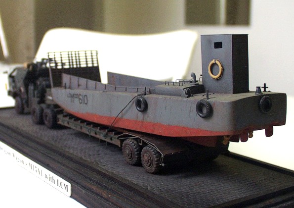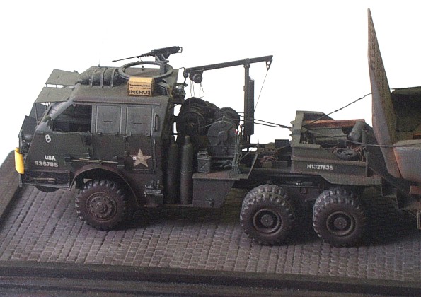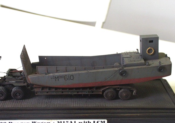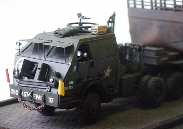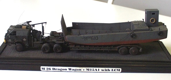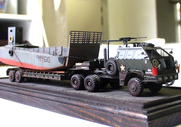 Used kits: 1/72 scale scratchbuilt M26 This model of M 26 is completely scratchbuilt according to drawings and reference pictures. The model includes all exterior and interior details. This M 26 is built with crane in position enabling to tow M15A1 trailer that is also completely scratchbuilt. The reference pictures of real vehicles transporting LCM assault boats from Normandy to Rhine inspired me when I was completing these models. Therefore I placed on the trailer this type of boat built with few modifications out of the kit by Airfix. I have added binding eyes, new wheel house atc. The transport set is realized is in classic color schema of US. Army and represents vehicle of 457. evacuation corps. It took me about 250 hours to complete this set. |