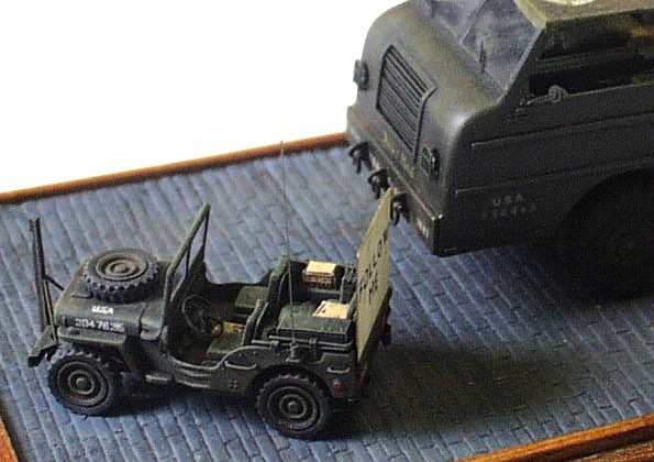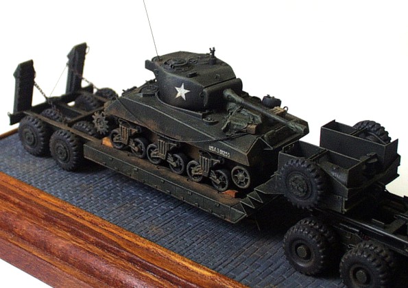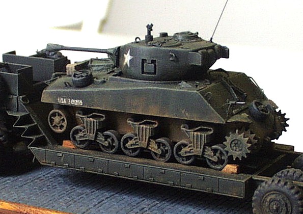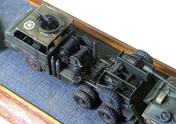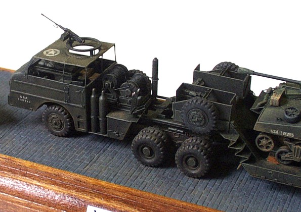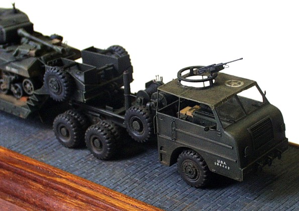 kits: M 26A1 Dragon Wagon – scratchbuildt in 1/72 scale M 15 trailer – scratchbuildt in 1/72 scale M4A3 Sherman (76mm), Revell/ESCI conversion in 1/72 scale Jeep Willis MB – 1/76 scale kit by Matchbox This model of M 26 A1 /not armored version/ is scratchbuilt according to drawings and reference pictures. The assembly of this model was much simpler because I used many parts I cast during scratchbuilding of previous two ”Dragons”. The model includes all exterior and interior details. The ”Dragon” tows scratchbuilt M 15 trailer that is little different from M 15A1. The model of M4A3 Sherman (76 mm) placed on the trailer is mixture of two kits. The hull is from M4A3 by ESCI and the turret with 76 mm gun is from M4A1(76) kit by Revell. I just completed few exterior details and placed it on the trailer. Last item is model of the Jeep that is built without any big modification straight out of the box. The camouflages are realized according to reference picture of real vehicles served in unknown unit of US Army. It took me about 200 hours to complete this set. |
