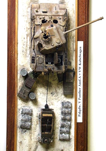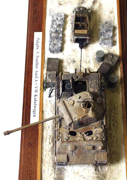 scale kit by ESCI VW Kûbelwagen - 1/72 scale kit by Airfix Etched parts : Eduard These models represent winter starting of “Panther” tank engine on East front in 1944. The camouflage schema is painted according to reference photo of command “Panther” Ausf. A tank from unknown unit. The model of the tank is built out of ESCI kit box practically without exterior modifications. I completed the kit with Eduard etched parts. The model is covered with zimmerit made of two-part putty. I completed my model with complete interior of the hull and turret, gearbox, engine, seats, gunlock, radio, engine fan atc. i The model VW Kûbelwagen is heavily modified Airfix kit. I have completed it with new doors and cowling scratchbuilt of aluminum sheet. I reduced mudguards, scratcbuilt new board and seats. I have completed kit with scratchbuilt engine and fuel tank. The tarp is made of paper. The starting device and shafts are is completely scratchbuilt according to reference documentation. It took me about 100 hours to complete these models. |