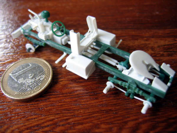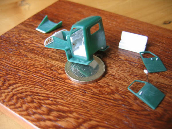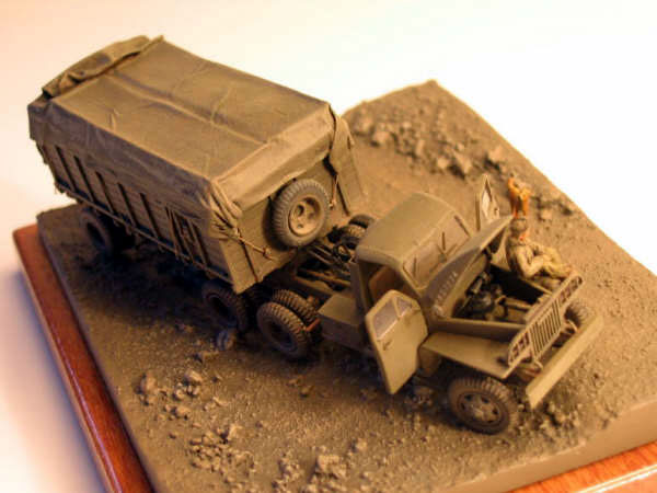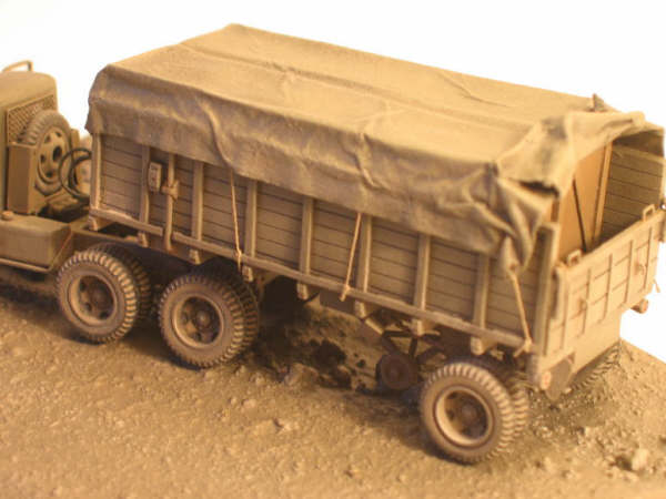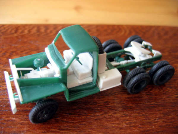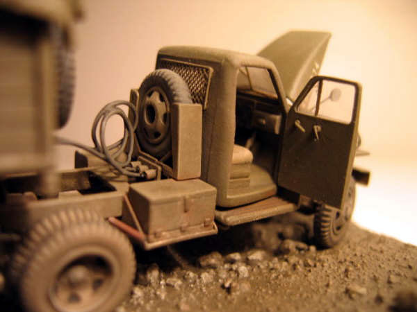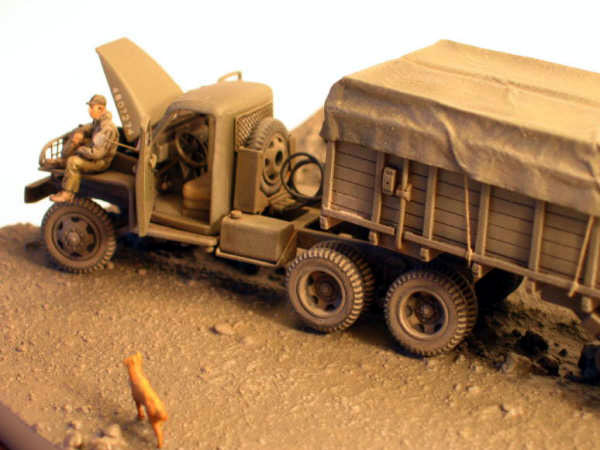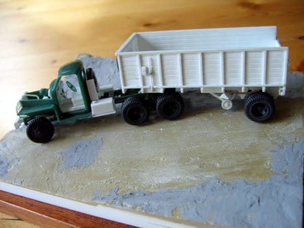 The combination consists of a conversion of the PST 162-inch W.B.-cargo truck to the 148-inch W.B.-tractor truck and a completely scratchbuilt semitrailer. Both with fully detailed interiors and exteriors. The figure is by Milicast and the dog is by Preiser. |