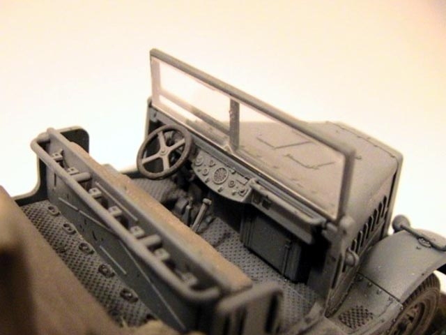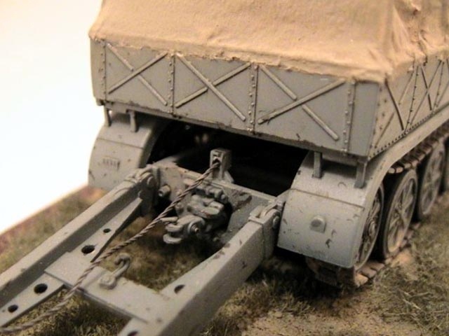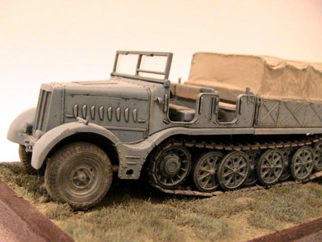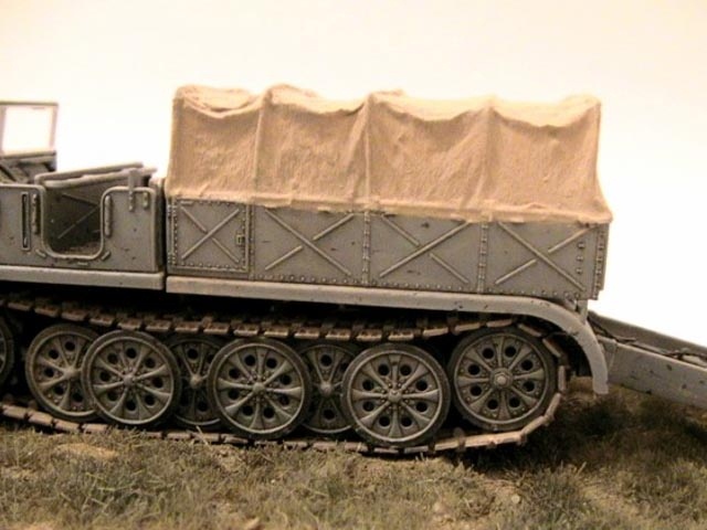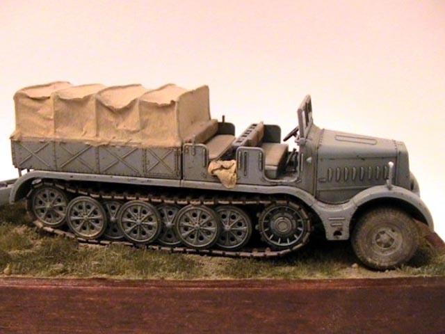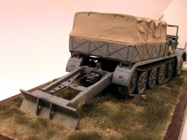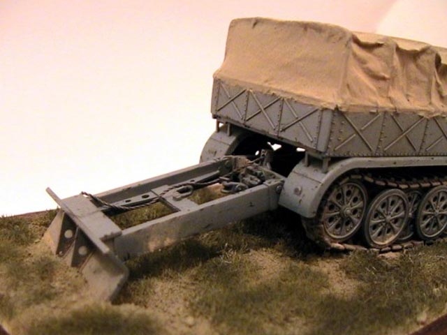 The model is built straight from the box except added tarpaulin made of tissue covered with Surfacer 500 and wire cable on rear blade. The Panzer Grau colour is mixed from Tamiya acrylics. The base is made of balsa wood. |