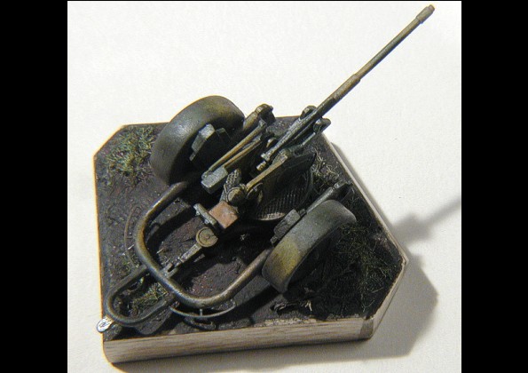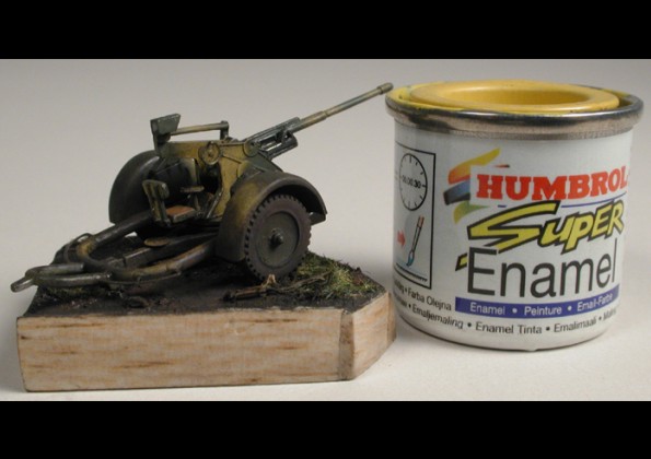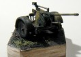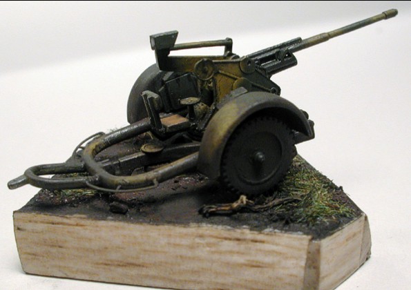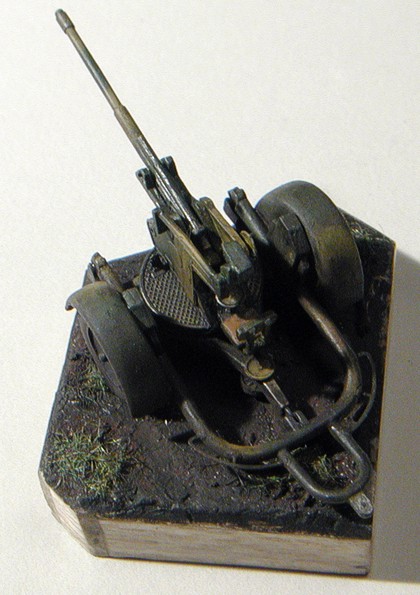 producer: MAC, 1/72 This kit is made by MAC (I’ve bought it on Model Hobby 2002 exhibition). There’re “moulded tree” of plastic in a box, nice instruction sheet and a sheet of needed PE parts. Work on flak is quick and easy. Except of two small parts (end of barrel and hooks for fitting gun into undercarriage) is everything made “straight from the box”. Mentioned end of a gun barrel I’ve cut off and made a new one from a part of injection pin (to cut a hard metal from which the pins are made I’m using a classical blade cutter). The former hooks disappeared too, and the new ones were cut from thin plastic sheet. PE parts are glued by cyanoacrylate glue HVP. Color scheme is (according to instructions) from 19th Pz.Div., Kharkov, 1943. Colors are Humbrol, airbrushed and fixed by glossy varnish Model Master. “Wash” is oil (black-gray) and the whole is fixed again and colors are unified, this way by flat Model Master varnish. Then ”Dry brush”, normal 2B pencil and chalk dust finished the illusion of weathering. Completed 20 mm Flak 30 is really a dwarf in 1/72 scale (see photo with Humbrol color), but it’s a very nice model… |