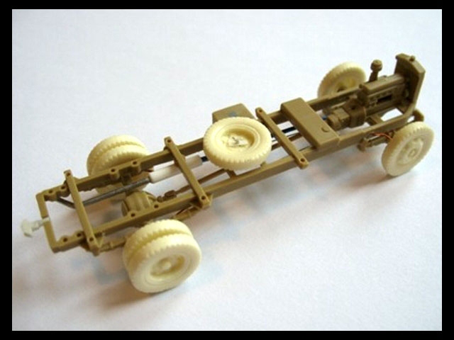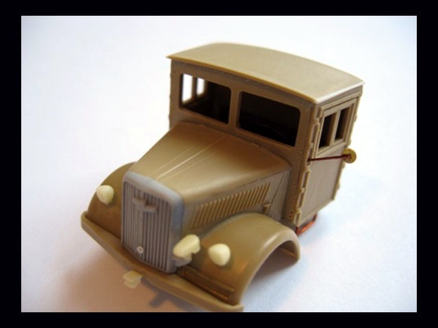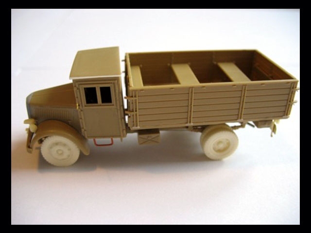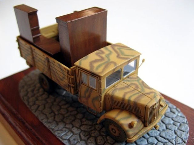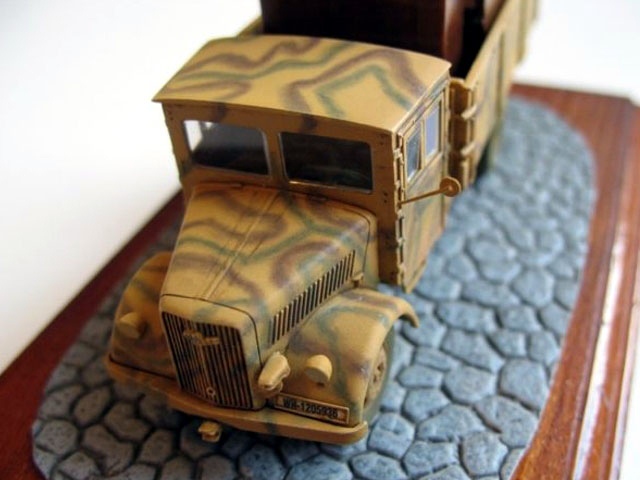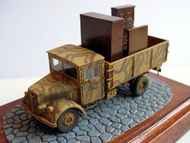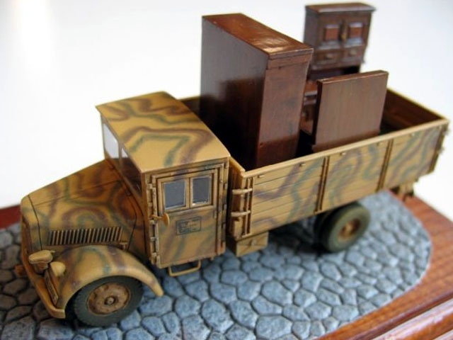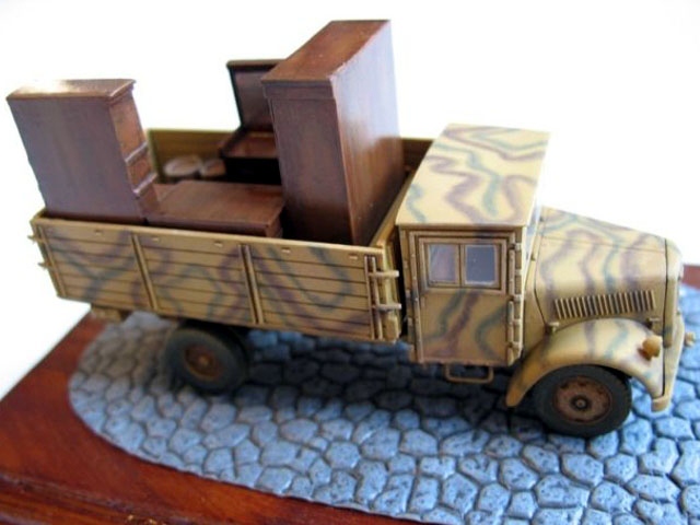 The kit includes both variants of vehicle cabs. I have decided to build the later one. As you can see on lower images I made some detailing using wheels and other parts from Retromodel kit and also front mask from old Airfix Opel. The "snake" camo is created with Agama Patinators. I have loaded the the truck with resin furniture to make this model more interesting. |