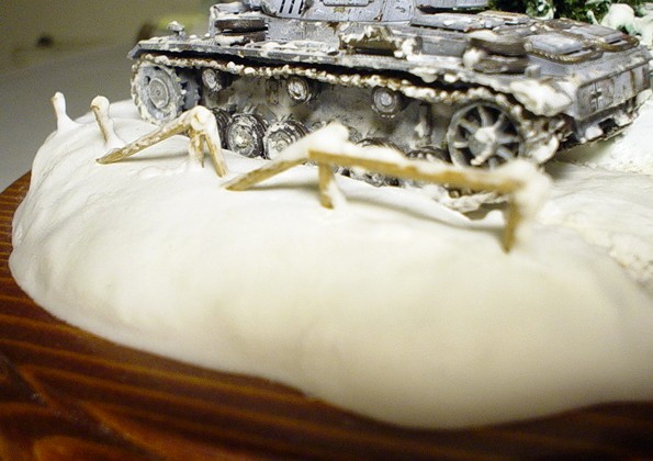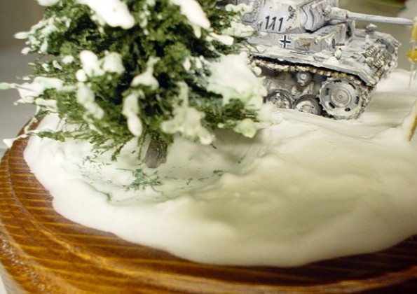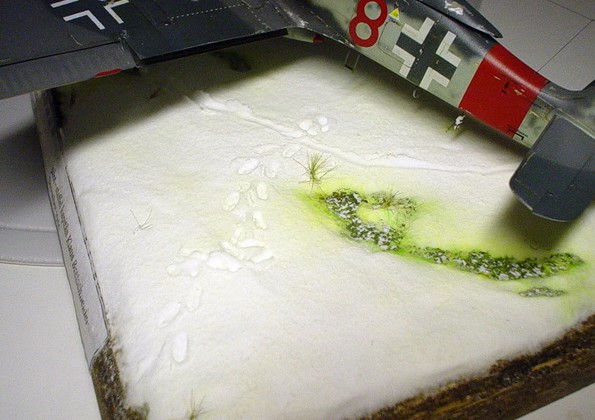 This method is nothing new under sun but I decided to remember it here. It was introduced by colleague Pavel Svejda in Czech modelling magazine (Modelar No.12/2003 ). All what you need is light whipped putty ONE TIME and some water too. The putty can be applied in relatively thick layer all depends on quantity of water you will use for dilution You can also apply the putty in several layers but you have to wait when previous layer gets dry. You can use almost everything to apply the putty all depends on the surface you want to cover with snow. It's possible to work with snow surface before the putty get dry. I prefer to use wet brush for this kind of work. You can also make footprints or grooves in the snow surface. When the snow surface is near to get dray you can spread it with little of Solamyl (potato starch). to get more real look but only a little because thicker layer of Solamyl can crackle when dryers. The putty takes every labile colour from the base so be careful which colours or base material you use. See what happens when you are not /pict. with FW190/. Panzermaniac |