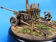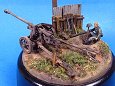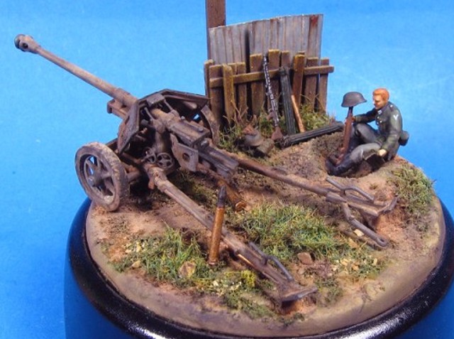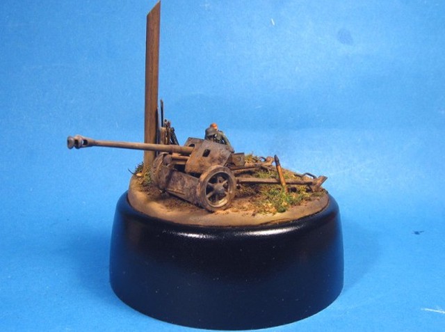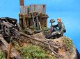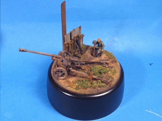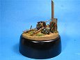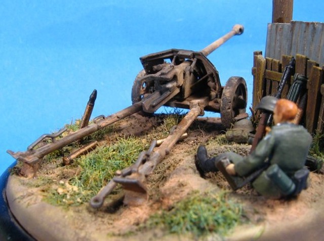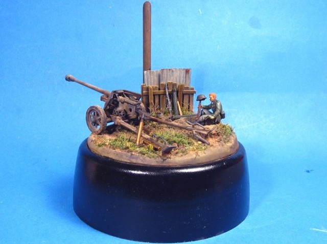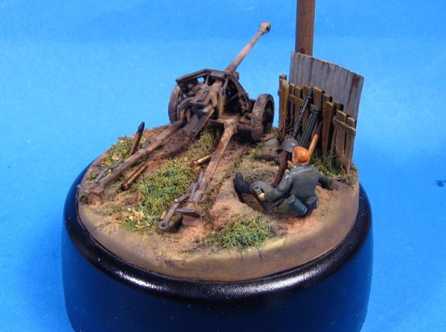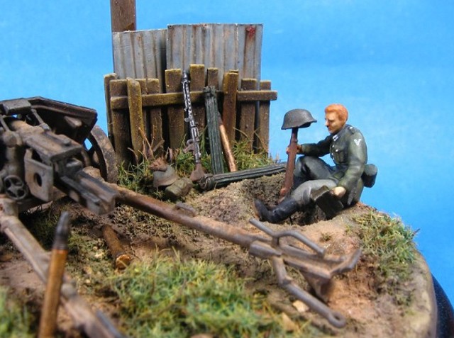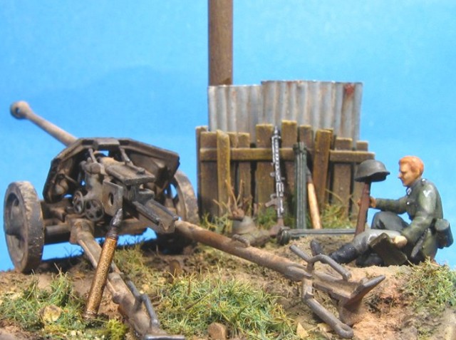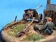 Měřítko: 1/72 Základem diorámy je model děla Pak 40 se setu od Airfix. Figurka vojáka je složen z různých dílů ze setů fy. Preiser. Podklad diorámy je hlíny Das Pronto. Plot je z balzy, vlnitý plech z hliníkové fólie. Na závěr jsem přidal trochu písku a statické trávy. K barvení jsem použil barev Humbrol a Tamiya. Na finiš posloužily olejové barvy a pigmenty od MIGa. |