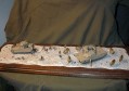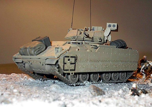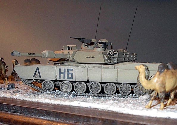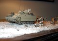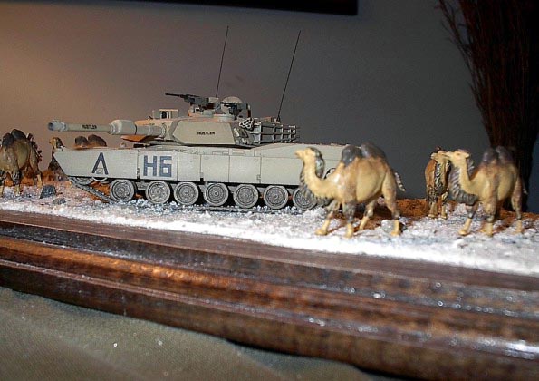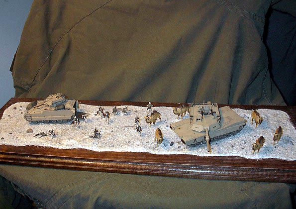 Měřítko: 1/72 Toto dioráma nazvané ”Poslední cvičení” představuje cvičení Americké armády na Středním východě před poslední válkou v Iráku. Obě obrněná vozidla jsou postavena bez větších úprav ze stavebnic fy Revell. Bagáže na vozidlech jsou od Verlindenu. Jsou docela pěkné, ale nesedí moc dobře a za své peníze jsem čekal trochu více kusů. Příště si je vyrobím sám, zejména karimatky a velké plachty. Figurky vojáků jsou od Preiseru. Jsou moc pěkné a ve skvělých pózách. Velbloudi jsou také od Preiseru, ale již nabarvení ze setu pro ”vláčkaře ”. Možná jsou pro dané měřítko příliš malí, ale asi je to zvláštní zakrslý druh.J Písek je z jedné ze severoamerických pláží. |
