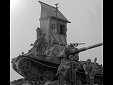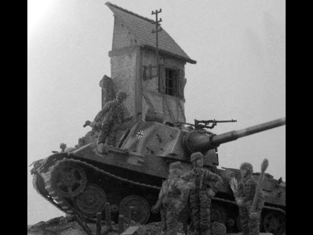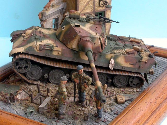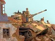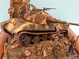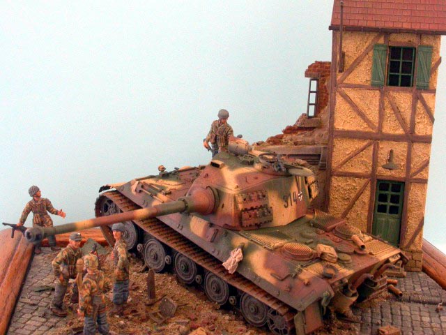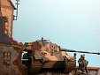 Měřítko: 1/72 Dioráma představuje scenérii z posledních dní 2.sv.války a zachycuje německé obránce během přestávky mezi boji. Model tanku King Tiger je postaven ze stavebnice od Revellu a je vylepšen směsí leptů od Eduardu a Partu. Přidal jsem i několik dalších doplňků pro vylepšení. Figurky německých parašutistů jsou ze setu od firmy ESCI. Zničená budova je scratch, přičemž jsem použil pár dílů (okna, okenice, dveře ... ) ze setu 1/87 od MKD. |