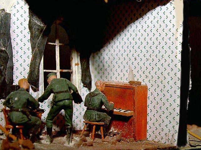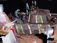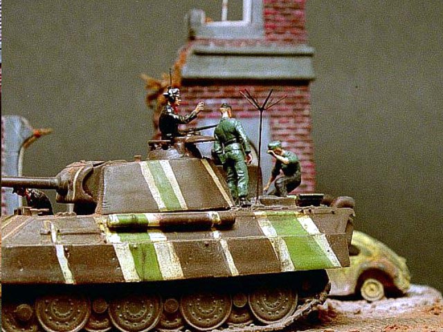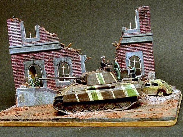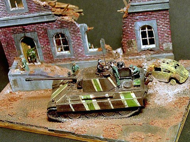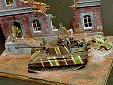 Měřítko: 1/72 Dioráma nesoucí poetický název "Poslední valčík v Berlíně" zachycuje část divize "Müncheberg" při přípravě na první a poslední bitvu.. Model velitelského tanku Panther Ausf.G pozdní produkce vznikl kombinací korby od Revellu, věže od Dragonu a celoocelových kol (Stahllaufrollen) od Hasegawy. Při stavbě jsou použil také kovovou hlaveň od Army in detail a lepty od Extratech. No a samozřejmě spoustu dílů vlastní výroby. Zničený Volkswagen Käfer “Brouk“ je postaven z resinového kitu od TP models. Vojáci jsou upravené figurky od Preiseru. |