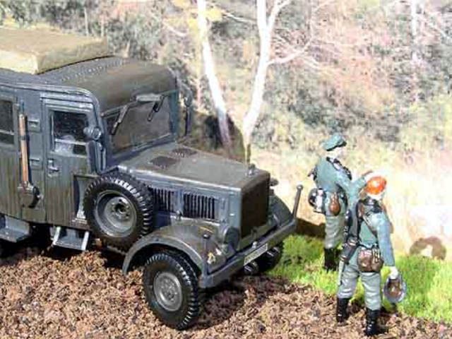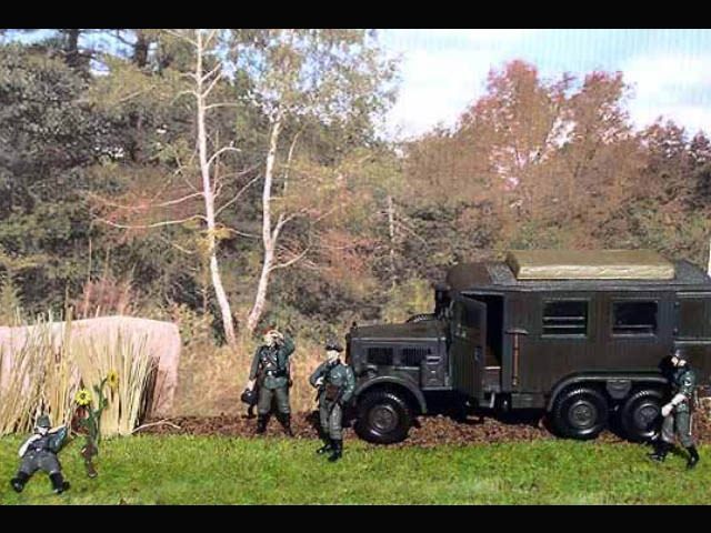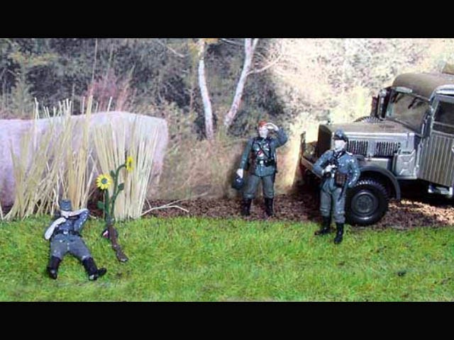 Měřítko: 1/72 Malá dioráma nazvaná “Krátká pauza" představuje německé vojáky krátce odpočívající během tažení na východ. Model Einheitsdiesel Radiowagen je od ZV Models, figurky od Preiseru a slunečnice od fy Busch (set 6003 Sonnenblumen). |