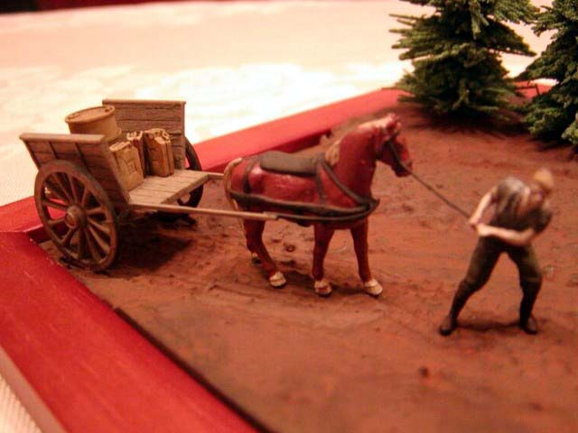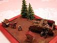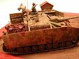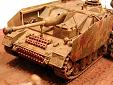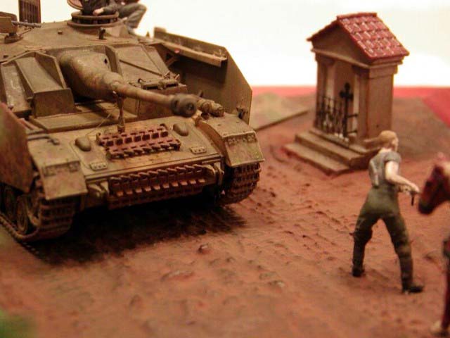 Měřítko: 1/72 Dioráma je postaveno na základové desce ze sololitu o tloušťce 5 mm a rozměrech 13 x 18 cm, pasující přesně do dřevěného fotorámečku. Hrubý tvar terénu jsem nejprve vymodeloval ze směsi sádry, jemných dřevěných pilin, bílého lepidla a vody, po vytvrzení jsem terén dotvořil vodou ředitelným tmelem na dřevo značky Soudal, do kterého jsem otiskl stopy vinylovým pásem z modelu Pz.IV od ESCI. Stejný tmel jsem použil i k slícování kapličky, pro kterou jsem nejprve zadlabal otvor do terénu. Po zaschnutí tmelu jsem celý základ přestříkal sprejem Humbrol – Dark Earth a pak jsem se pustil do finiše pomocí pigmentů MIG Productions, se kterými jsem různě experimentoval (ředění terpentýnem, vodou, suché nanášení a následné přelakování...). Název tohoto dioráma je „Komm, schneller, komm…!“ („Pojď, rychleji, pojď…!“). Použitá stavebnice: Sd.Kfz. 167 StuG IV (Late) - Dragon (Kit No. 7260) Použité doplňky: - kovová hlaveň a úsťová brzda ABER (72L-14) - motor Extratech (EXK 72016) - boční pancíře Extratech (EXV 72008) - figurky Preiser (různé sady) a Revell (02515 German Artillery) - mula Airfix (01752 German Mountain Troops) - vůz Minimali Productions (No. 006 Farmer’s Cart) - barel, kanystry a trychtýř Attack (RE 72321) - kaplička Extratech (EXB 72001) - stromy Mobe (130013) - vlastní doplňky Vzhledem k tomu, že model nabízí varianty v provedení předních tažných ok, a protože jsem se chtěl vyhnout aplikaci Zimmeritu, musel jsem se nejprve rozhodnout, které úpravy provedu a ze kterého období bude můj StuG IV pocházet. Vzhledem k tomu, že model má na každé straně tři podpůrné kladky pásů, jedná se o typ vyráběný od poloviny prosince 1944. Další úpravy a jejich data jsou: svislé trubkové výfuky (08/44), ukončení aplikace Zimmeritu (09/44), podpěra hlavně (11/44), kryty periskopů řidiče (11/44), zámek poklopu řidiče (11/44), nové tažné zařízení vzadu (prováděno polními dílnami od 12/44) a nová tažná oka vpředu (12/44) – ta ale nebyla plně zavedena do výroby ani do konce války a ani já jsem je nepoužil. Můj model tedy znázorňuje typ, vyrobený někdy od prosince 1944, sloužící na východní frontě na jaře 1945. Stavba modelu je naprosto bez problémů a přestože mám a priori nedůvěru k pásům vcelku, byl jsem překvapen jejich snadnou instalací a „ochotou“ akceptovat kyanoakrylátové vteřinové lepidlo. Otevřené kryty motoru mne zlákaly k instalaci „střev“ ze sady Extratech, ale podlahu pod motorem je ale nutno mírně zkrátit (cca o 2 mm), aby se celá sestava do motorového prostoru vešla. Boční pancíře jsou určeny pro stavebnici od Revellu/Matchboxu, ale dají se použít i na tento model, i když mám pocit, že sedí trochu vysoko (díky Milane za tento postřeh!). Antény jsou z chlupů z malířské štětky, proud tekoucího benzínu z průhledné tyčinky, vytažené nad plamenem, hadice z cínové pájky, kabely sluchátek velitele z měděných drátků. Model je natřen štětcem barvami Humbrol a Agama, wash olejovými barvami Mánes, rozpuštěnými v benzínu Zippo, ušpinění pigmenty MIG Productions. Figurky upravené z různých sad firmy Preiser a jeden dělostřelec od Revellu, mula je od Airfixu, vůz od Minimali Productions, trychtýř, barel a kanystry ze sady „German fuel set“ od Attacku. |