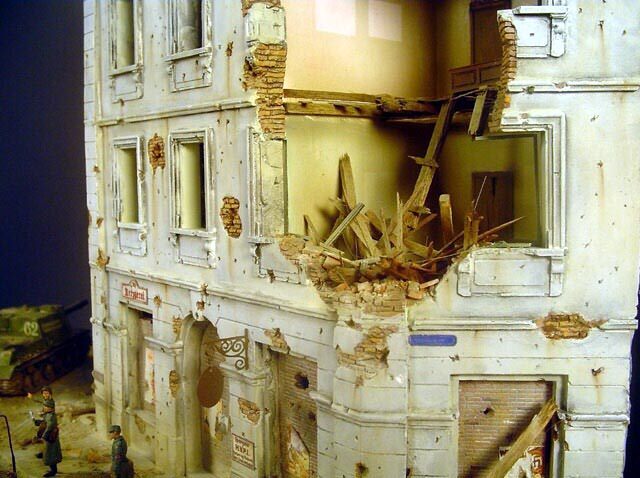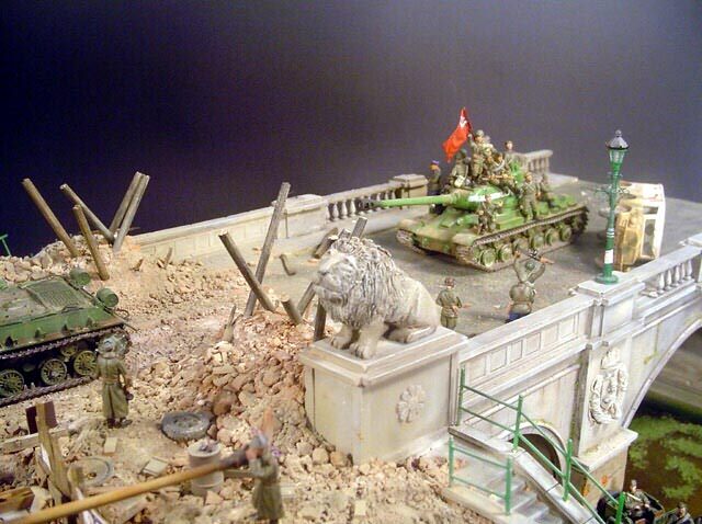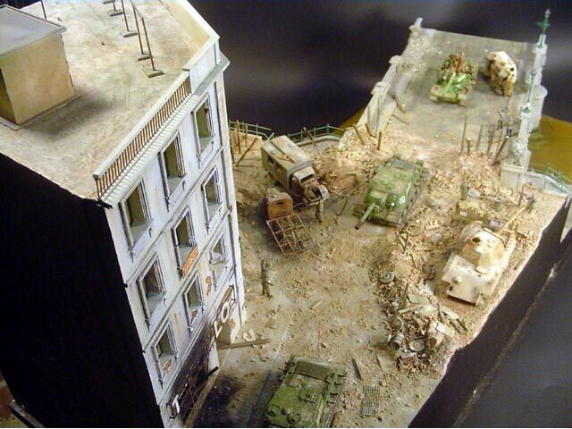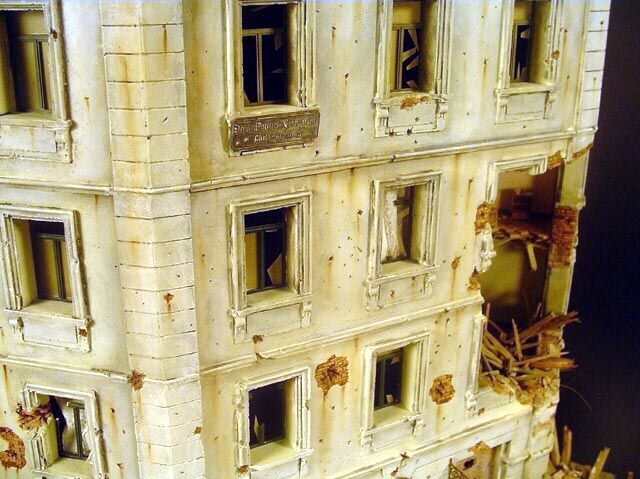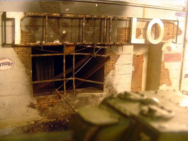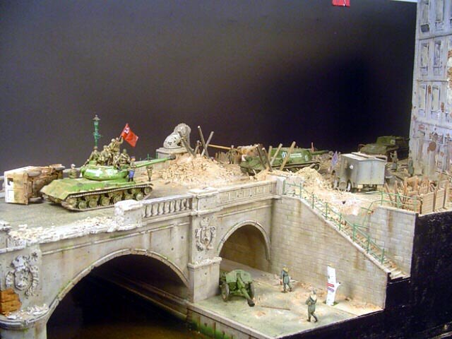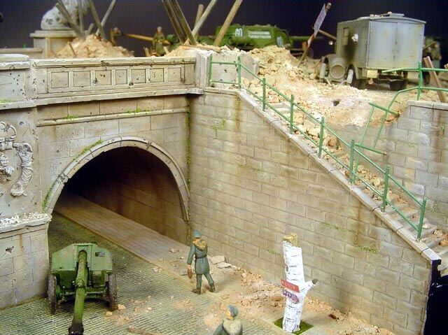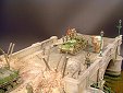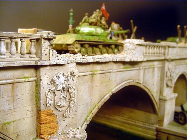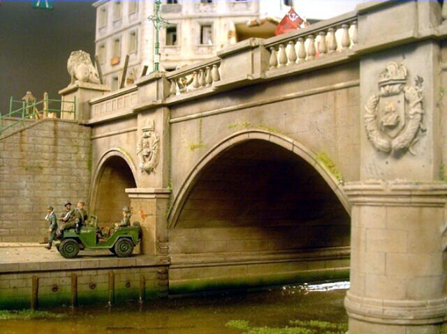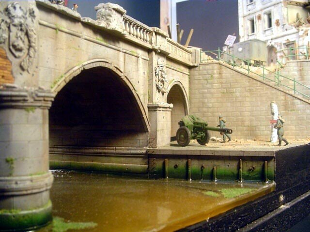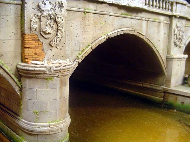 AL-by. Základ diorámy tvoří dřevěná deska 75 x 35 cm. Most je postaven také ze dřeva, přičemž je pokryt plastovými deskami Evergreen, do kterým byla předem naznačena struktura kamene a dlažby. Voda je z polyesterresinu. Díly budovy jsem nejprve sestavil z plastu, poté odlil ze sádry a naznačil na ně detaily, cihly a poškození. Dlážděná podlaha je přerytá plastová deska. Rámy oken jsou také z plastu, stejně jako zátarasy na ulici jsou z plastu, včetně cihel. |