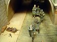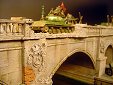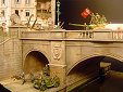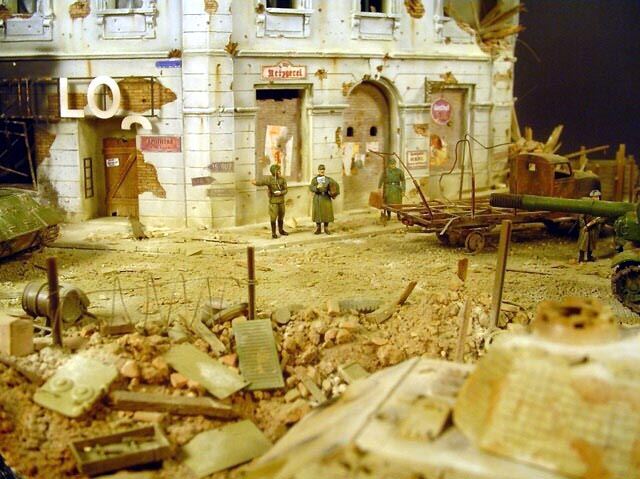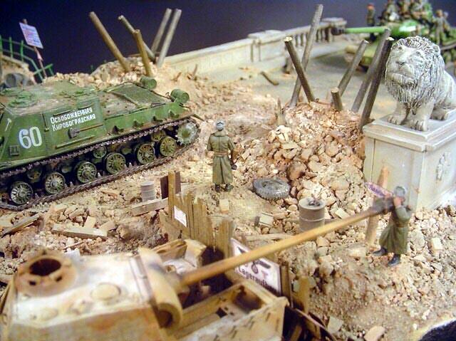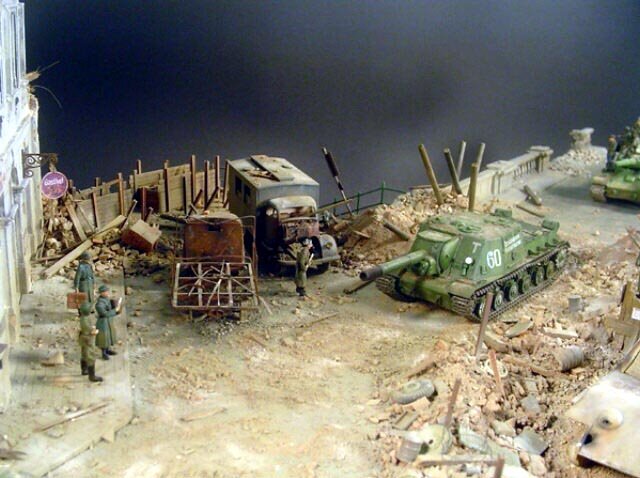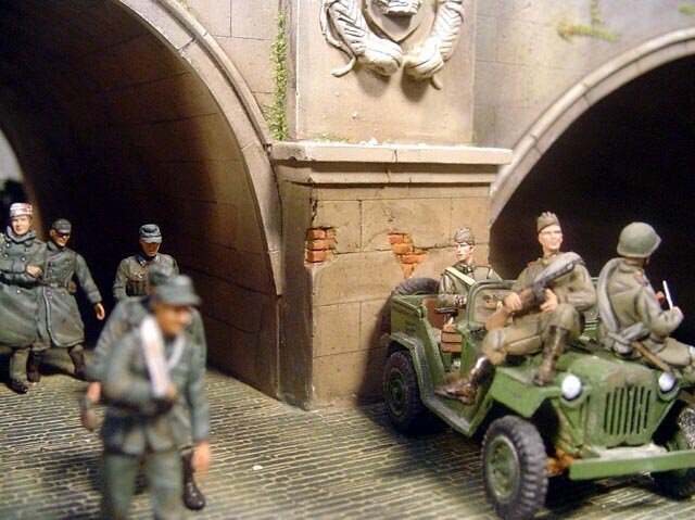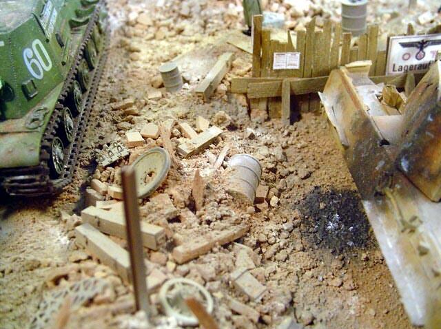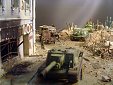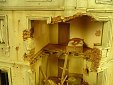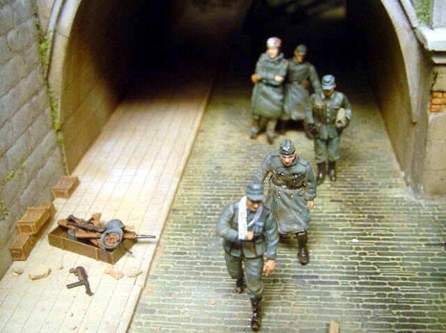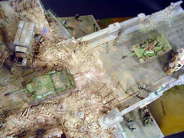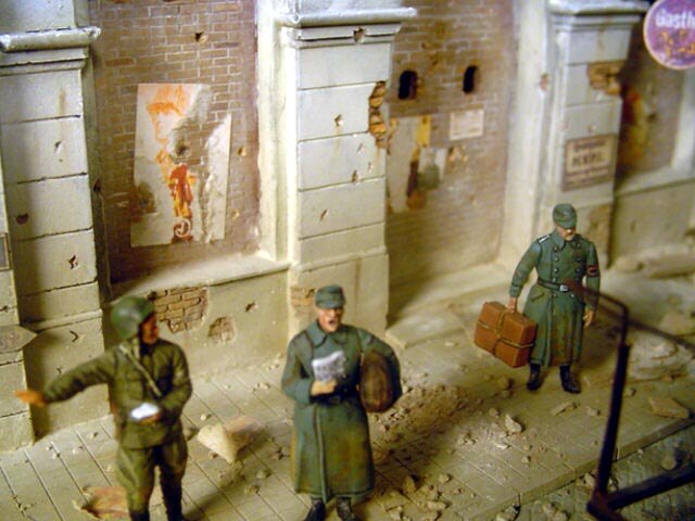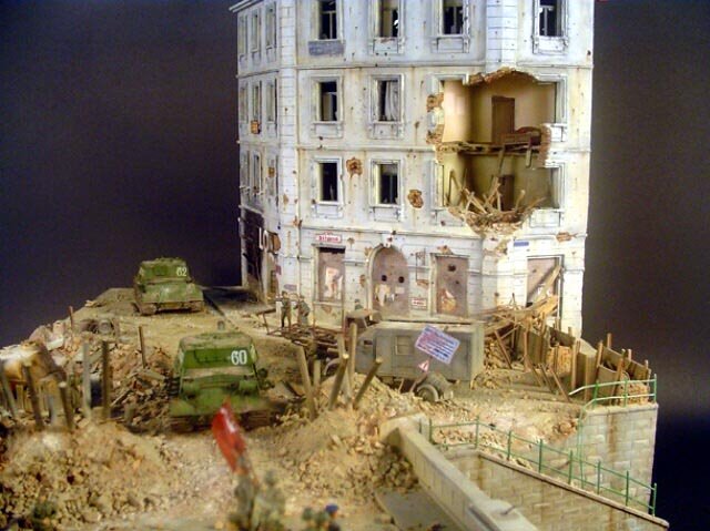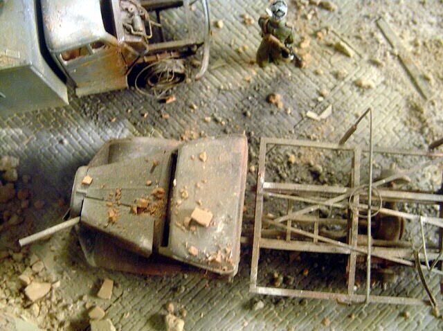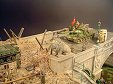 AL-by. Základ diorámy tvoří dřevěná deska 75 x 35 cm. Most je postaven také ze dřeva, přičemž je pokryt plastovými deskami Evergreen, do kterým byla předem naznačena struktura kamene a dlažby. Voda je z polyesterresinu. Díly budovy jsem nejprve sestavil z plastu, poté odlil ze sádry a naznačil na ně detaily, cihly a poškození. Dlážděná podlaha je přerytá plastová deska. Rámy oken jsou také z plastu, stejně jako zátarasy na ulici jsou z plastu, včetně cihel. |