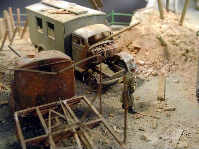 vyhořelý Opel Blitz je scratch, ambulance a Gaz jsou od