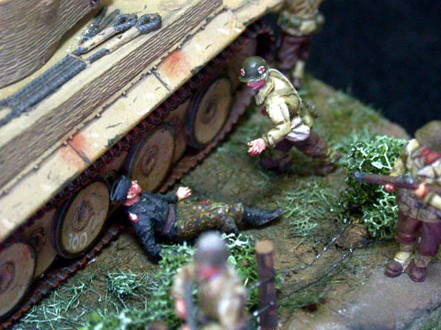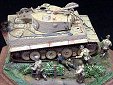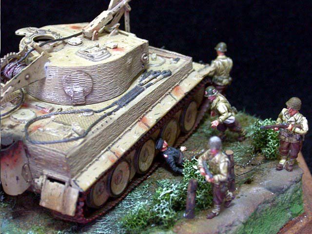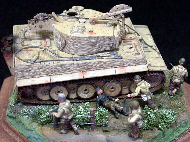 Měřítko: 1/72 Model: Bergepanzer Tiger - DML Dragon Model je vylepšen hlavně lepty od Eduardu ale něco málo je také od Partu. Fugurky Američanů jsou US Infantry Foot Patrol set od Milicastu, přičemž medik je jedna upravená figurka z téhož setu. Německý takista je upravená figurka od Preiseru.. Ostnatý drát je lept od Extratechu. |
