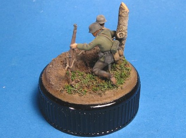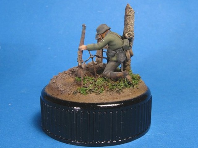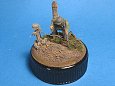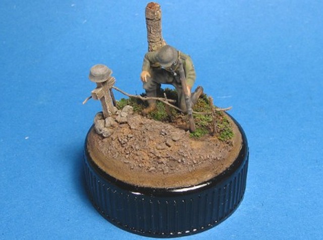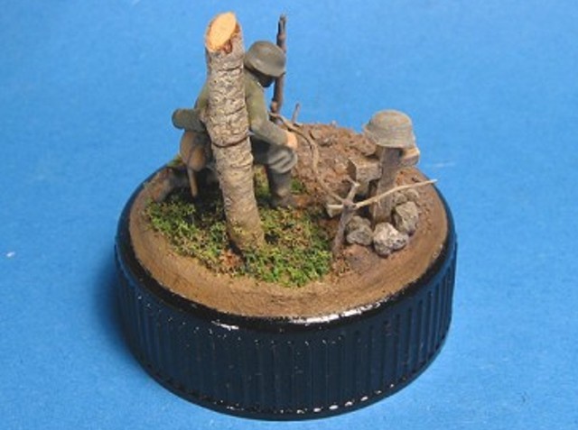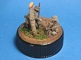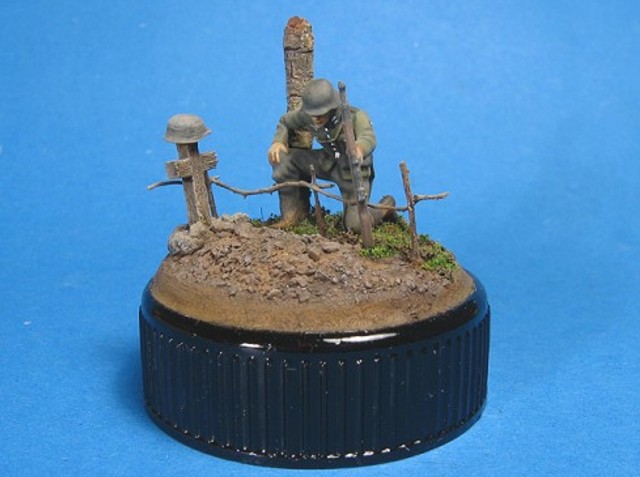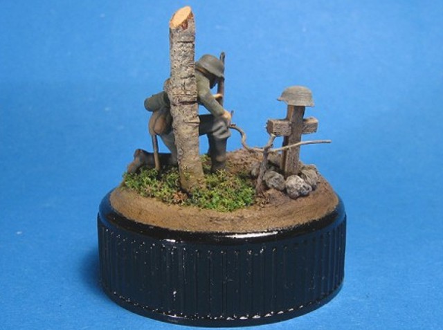 Měřítko: 1/72 Základem je figurka dělostřelce ze stavebnice Opel Blity s dělem Pak 40. Na tu jsem narouboval ruce a hlavu ze setu od fy. Preiser. Podklad viněty tvoří víčko od jogurtu s trochou modelářské hlíny s trochou statické trávy. Kříž je z balzy a kmen je větvička. K nabarvení figurky jsem požil barev Humbrol a na podklad Tamiya. Na finiš pak olejové barvy pigmenty od MIGa. |