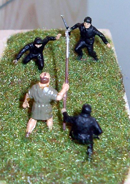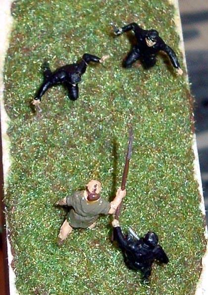 Na této minidiorámě nazvaná "Přepad Nindů" vidíte tři figurky upravené z Commandos od Helleru /ex Airfix/ a jednu figurkou ze setu Robin Hood od Hätu, takté upravenou.