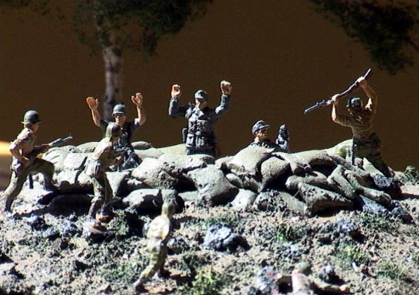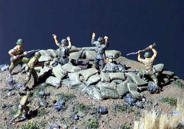 Toto malé dioráma je inspirováno filmem "Zachraňte vojína Ryana". Je jedno z mých prvních a při jeho stavbě jsem si vyzkoušel zejména úpravu figurek. 2 Airfix American Marines, 2 Američané vznikli úpravou z DAK od Airfixu, 1 Němec je také z DAK od Airfixu a ostatní jsou od Revellu z ženijního setu. |