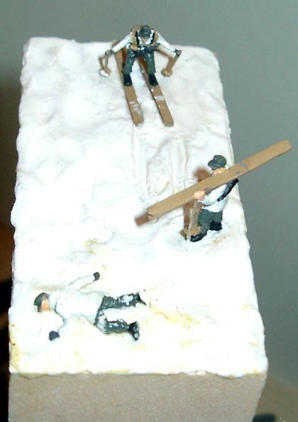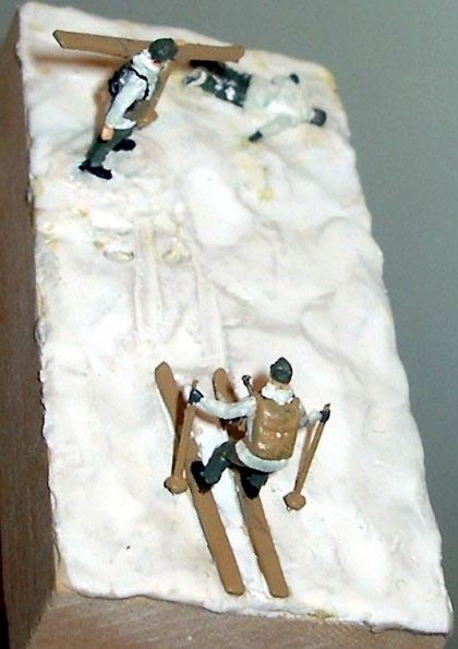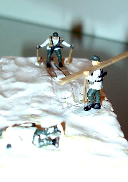 Tři figurky ze setu německých horských myslivců od Airfixu jsem umístil na malou diorámu nazvanou "Zmrzlý Gebirsjäger". Na jednou z figurek jsem přidal samopal a sumky ze setu Fallschirmsjäger od Revellu.