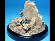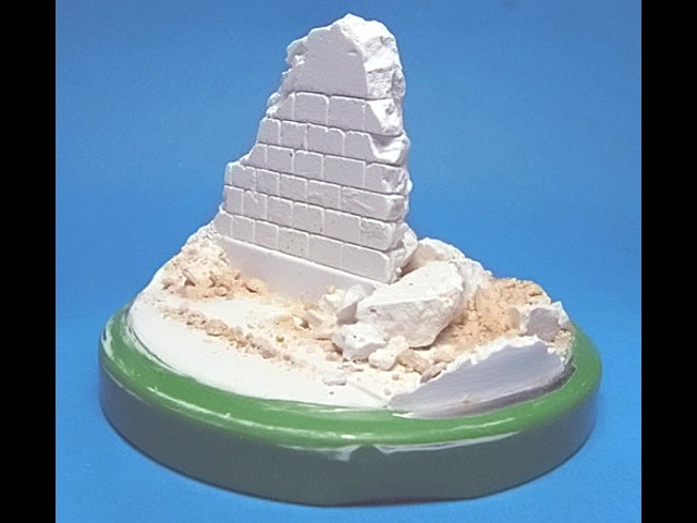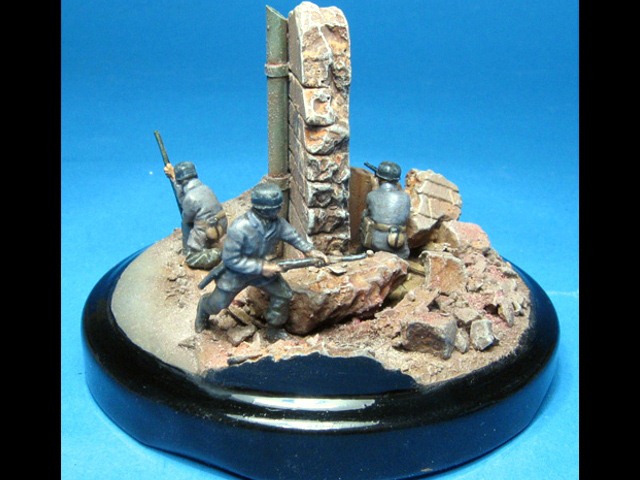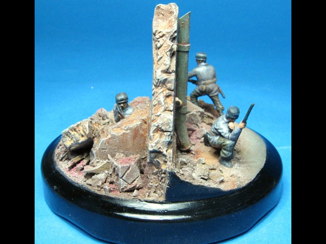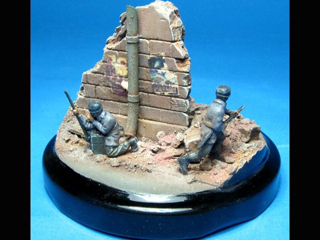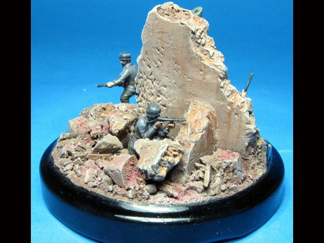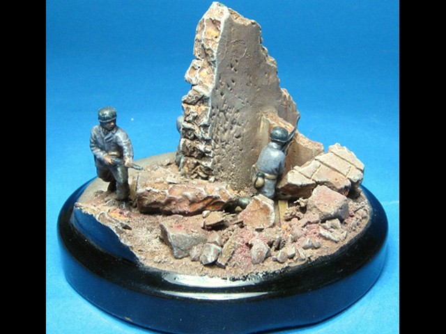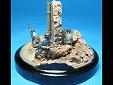 Ruiny a podklad vyrobené ze sádry jsem umístil na víčko ze skleničky na fazole. Nabarvil jsem je akryláty Tamiya a napatinoval oleji a křídovým prachem. Malý propagandistický plakát jsem si vytiskl la laserové tiskárně, ale to bohužel není nic moc. |