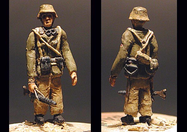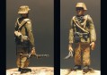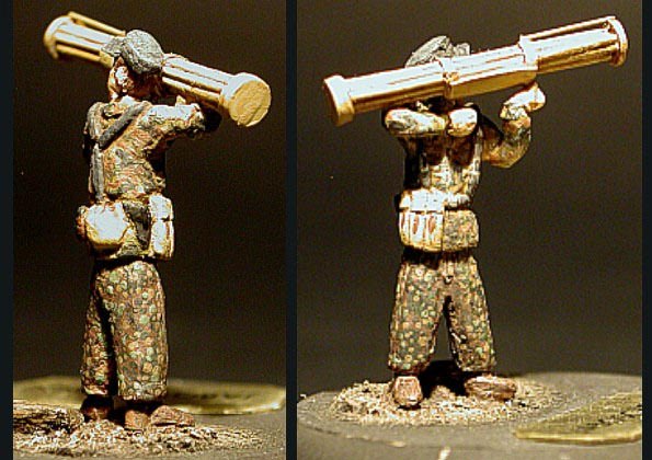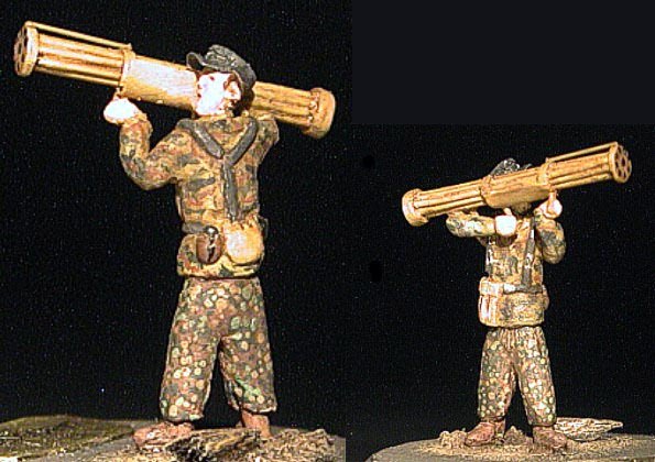 | Zde vidíte tři z mnou vlastnoručně vyrobených figurek. Nejprve si z drátku vytvořím kostru postavy a na tu pak postupně v několika vrstvách nanáším tmel Milliput. Luftfaust (experimentální protiletadlová zbraň), kterou drží jedna z figurek je také scratchbuilt. |