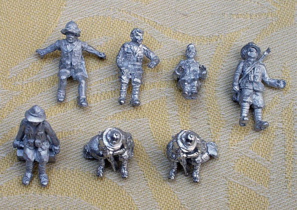 | Kvalita | Tento figurkový set obsahuje 7 figurek z toho dvě jsou stejné, dva pytle a bednu.Figurky představuji italské vojáky v tropických uniformách. Figurky jsou odlity dosti hrubě a mají "trošku" větší hlavy. Mají velmi pěkně ztvárněné typické italské tropické přílby. |