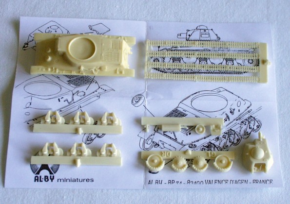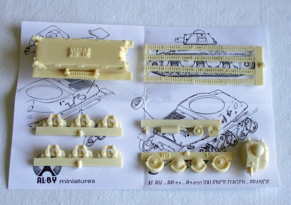 | Kvalita | Jednotlivé díly modelu jsou velice čistě odlity z resinu, pouze na některých naleznete jemné snadno odstranitelné otřepy a nálitky vzniklé při odlévání. Na všech dílech jsou znázorněny i jemné detaily (např. nářadí na korbě, nápis HOTCHKISS na čelním pancíři apod.). Věž je odlita jako dutá s možností otevření zadního poklopu. Zajímavé je řešení pásů, které jsou částečně odlity i jako součást dílů korby a hnacích a napínacích kol podvozku. |