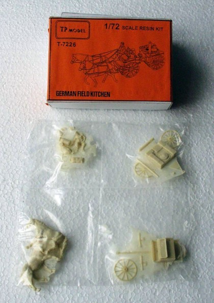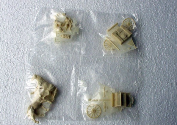 | Kvalita | Jednotlivé díly modelu nejsou odlity špatně, jen na některých najdete malé množství bublin a přetoku. Největším problémem je, že všechny díly jsou zality tenkou blánou resinu vzniklou při odlévání. Zkušený modelář si však s jejím odstraněním jistě poradí. Model obsahuje i doplňky jako konve, várnice a pytle a figurku kočího. Jedinou důležitou částí, která v modelu z pochopitelných důvodů chybí, je postroj pro koně. Na jeho výrobu z papíru a drátků však výrobce přikládá jednoduchý návod včetně schematického náčrtku. |