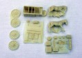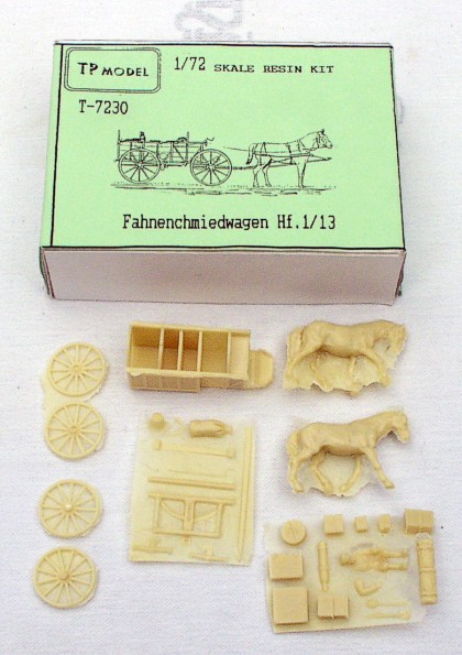 | Kvalita | Jednotlivé díly modelu nejsou odlity špatně, jen na některých najdete malé množství bublin a přetoku. Největším problémem je, že všechny díly jsou zality tenkou blánou resinu vzniklou při odlévání. Zkušený modelář si však s jejím odstraněním jistě poradí. Korba vozu je odlita jako jeden kus a působí poněkud masivně. Model obsahuje i doplňky jako pytle, kbelíky, bedny a také figurku kočího. Jedinou důležitou částí, která v modelu z pochopitelných důvodů chybí, je postroj pro koně. Na jeho výrobu z papíru a drátků však výrobce přikládá jednoduchý návod včetně schematického náčrtku. |