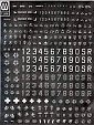 Aršík obsahuje číselné řady, různé typy trámových křížů („Balkenkreuze“), emblémy jednotek Wehrmacht a SS a taktická označení vozidel. Jedná se o suché obtisky (propisoty), tištěné v bílé barvě, kvalita je velmi vysoká, soutisk perfektní. |