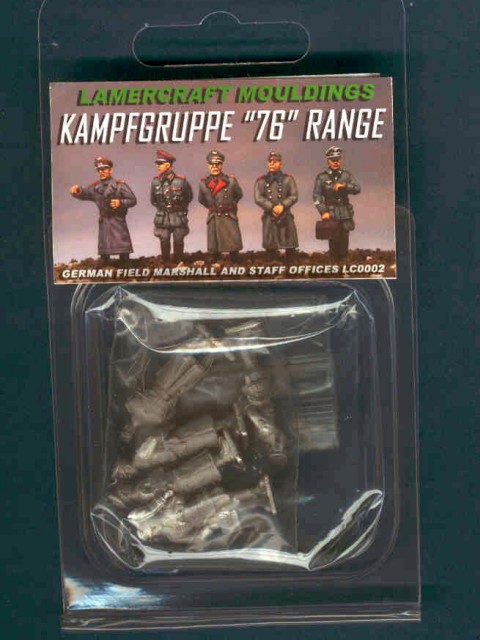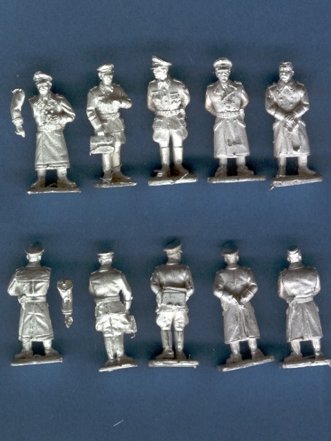 Jedny z nejlepších kovových figurek, jaké jsem kdy viděl! Sadu tvoří celkem pět důstojníků, čtyři jsou odliti vcelku, jeden má separátní pravou ruku. Postavy jsou velmi dobře zpracovány: mají velmi přirozené pózy a skvělé jsou i proporčně – netrpí častou „nemocí“ kovových figurek, jako jsou velké hlavy a ruce. Figurky mají v rukou i různé detaily (aktovku, složku se spisy, dalekohled), jeden důstojník se dívá na hodinky. |