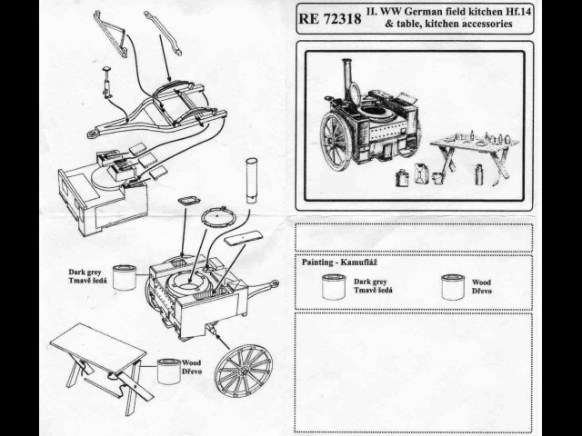 Německá polní kuchyně Hf.14, stůl a kuchyňské potřeby – 1/72