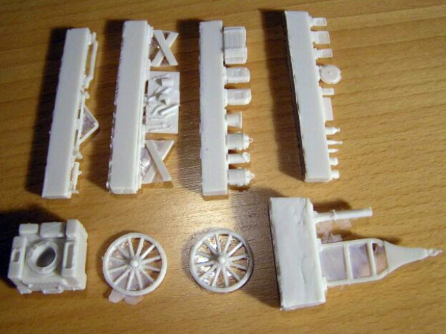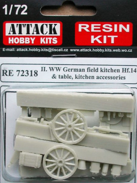 Toto je můj třetí model německé polní kuchyně (jiné dvě mám od Fine Scale Factory a TP Models) a musím říci, že je nejlepší z nich! Kotel a dva menší prostory na vaření a smažení jsou odlity jako otevřené, se samostatnými poklopy. Detailně jsou propracovány i popelníky na spodní straně kuchyně (ale ty vyniknou pouze při znázornění převrácené kuchyně v příkopu…). Sada obsahuje dále stůl s rozloženými potravinami (bochník chleba, nakrojený sýr, tyčka salámu) a kuchyňskými potřebami. Vše odlito jako jeden kus: detail je vynikající, jeho vybarvení bude šílenstvím! V sadě je i několik kuchyňských nádob a lahví. Díly jsou čistě odlity ze šedého resinu, s malými otřepy, bez bublin. |
