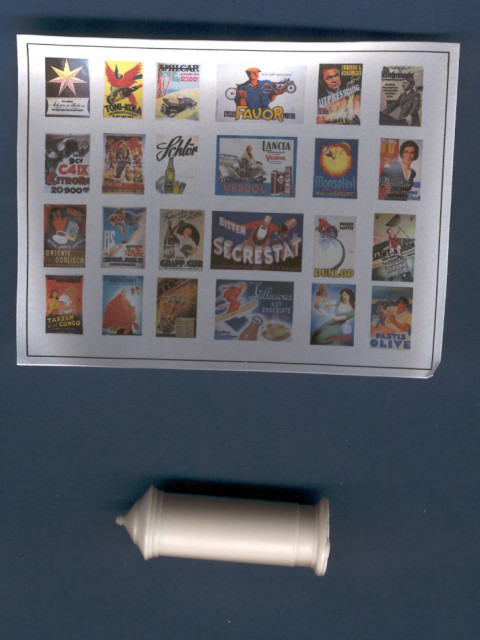 Resinový odlitek sloupu a barevný papírový aršík s 24 dobovými plakáty |
