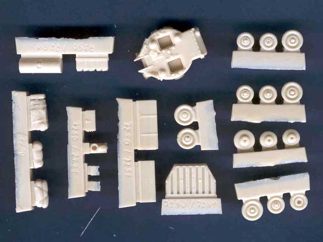 Sady obsahují ze světlého resinu odlitá kola, věž, schránky na nářadí a pár